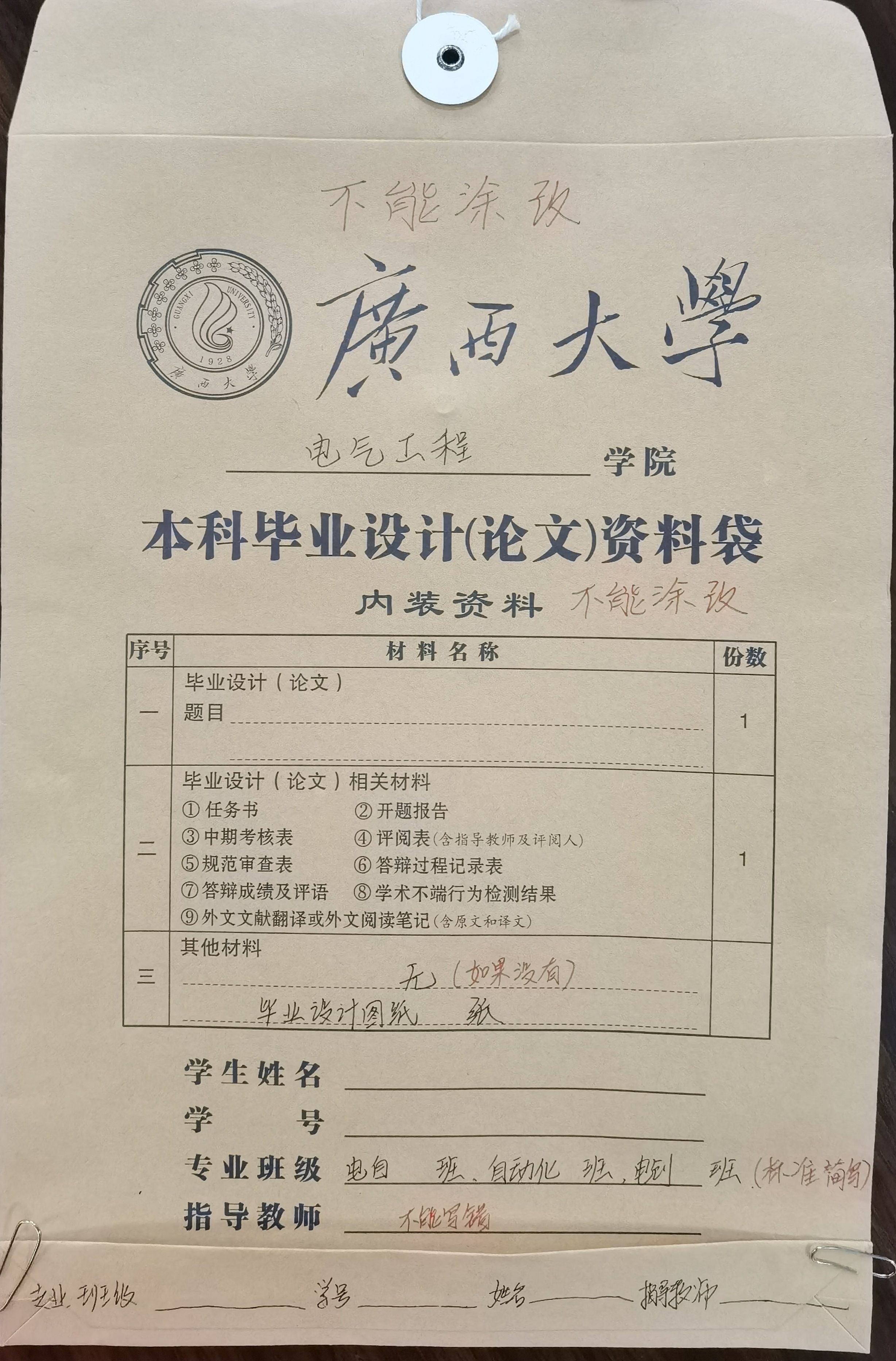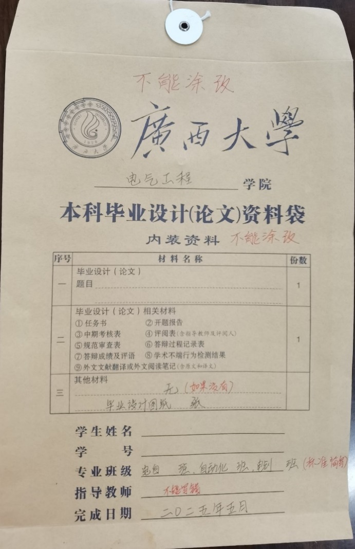 1、各班班长到104领回论文归档资料袋,同学自行整理,装袋。资料袋封面填写内容不能涂改。