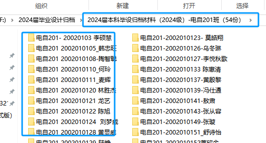2、各班班长、团支书收齐后,到104找教学秘书拷贝,班级文件夹命名为:2025届本科毕设归档材料(2021级)-XX班(班级简称)