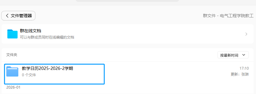 1)命名格式:教学日历(2025-2026-2)+任课教师+课程名(与教务系统一致的全称)+(教学班)。上传到学院教工群文件夹:教学日历(2025-2026-2)。