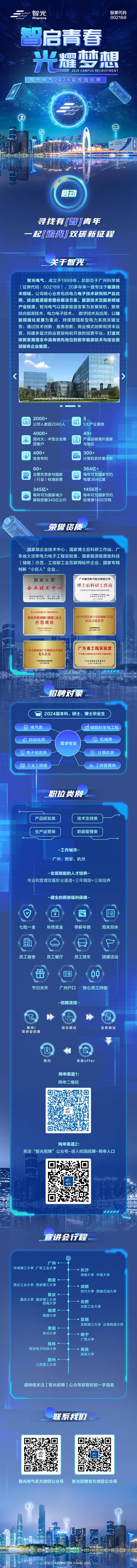 【智光电气2024届校招宣讲会——广西大学专场】智光集团(股票代码:002169)成立于1999年,总部位于广州,公司核心产品包括电力电子产品、储能系统及产品、电力传输产品,均处于国内领先水平。 400+各类专利 300+计算机软件著作权 60+主要负责或参与国家(行业)标准起草 2000+人数规模 4000+国内大、中型企业集团客户……【所需岗位及专业(2024本硕博应届毕业生)】1、电气工程师:电力/电气工程系统及其自动化、工业工程等相关专业;2、研发工程师:电气工程、自动化、控制工程、电力电子与电力传动、能源与动力工程、动力工程及工程热物理、计算机类等相关专业;3、结构工程师:机械设计制造、机械电子工程、自动化等;4、财务专员:会计学、财务管理专业等;5、储备干部:专业不限;【宣讲会流程】学校宣讲会 →面试 (第 1天)→发放offer (第 2天)→签约宣讲会结束,第 2天安排面试,面试结果当天告知,最快 第2 天即可拿到令人心动的offer【薪资福利】1. 有竞争力的薪酬2. 成熟的培训及晋升机制3. 生活无忧,七险一金+员工餐厅+通勤班车+温馨宿舍+周末双休+各种不定期福利【投递方式】附上网申二维码,扫码即可网申 越早投递简历,越早筛选简历,宣讲会结束后即可安排面试,离offer更近一步 宣讲会时间地点 学校:广西大学宣讲教室:beats365(中国区)-唯一官方网站201宣讲时间:9月7日(周四) 19:00智启,星辰大海光耀,广阔天空智光电气,期待你的加入!!