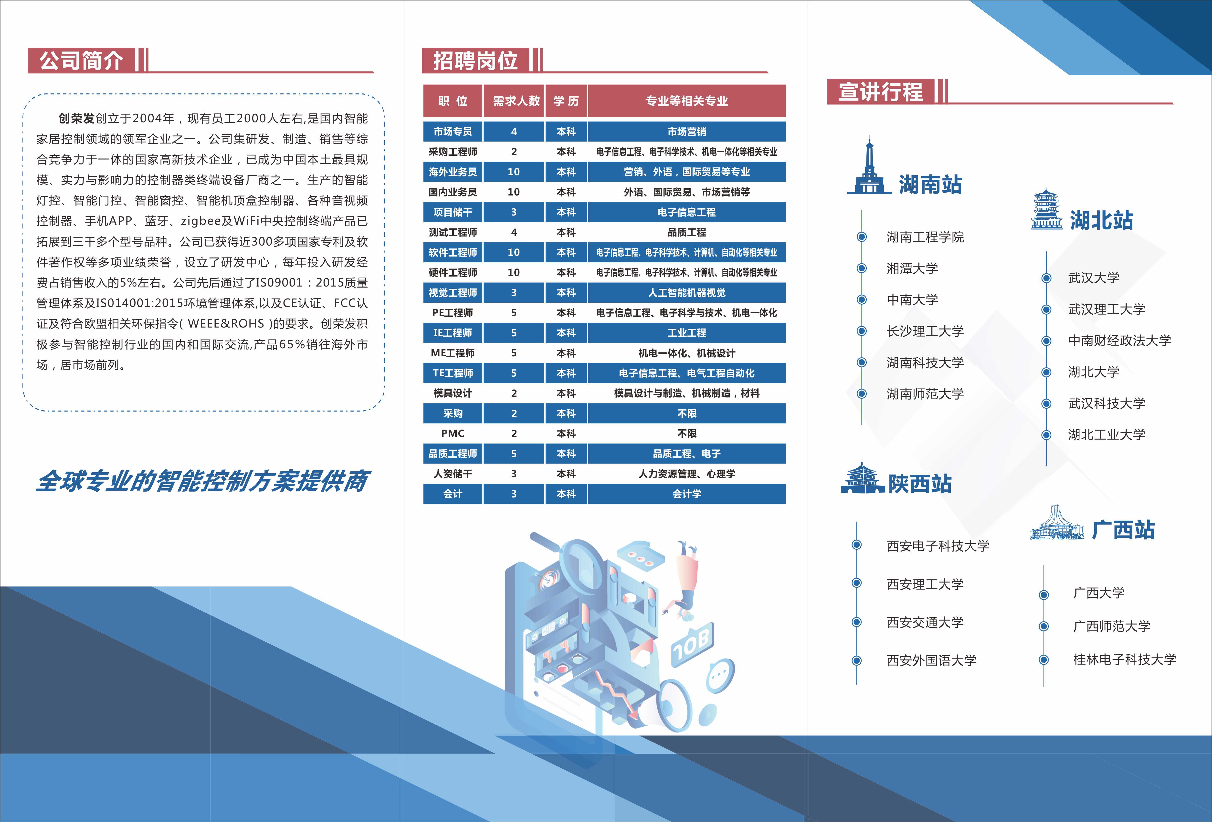 创赢未来职等你来!【广西大学宣讲会】宣讲地点:广西大学东校园大学生活动中心三楼培训室(319)宣讲时间:11月10日下午15:00-17:00岗位研发类:软件工程师、硬件工程师技术类:专利工程师、视觉工程师、PE工程师、模具设计、结构工程师、品质工程师、生产储干运营服务类:采购工程师、会计、市场专员、外贸业务、人资储干投递方式宣讲会现场可扫码投递电子简历或纸质简历,有HR现场面试,网申渠道:adm09@cn-cdrc.com。深圳创荣发欢迎你的加入!@全体成员