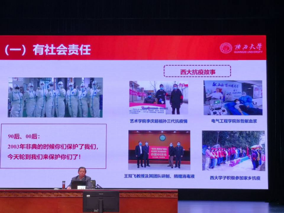 其次是“不负韶华,做青春起跑线上的领跑人”书记先肯定了我们2020级大学生生于非典,考于疫情,终上大学的不易和高中时代的优秀正直的品格、自立自主的学习态度接着引用莎士比亚“凡为过去,皆为序章”的名言,警示我们不要沉溺过往,当把握当下,展望未来,认真规划自己的大学生活,充实过好每一天,不负青春韶华,当如毛主席所言“自信人生上百年,会当水击三千里”以吾辈之才,勇担吾辈之责,圆梦未来。