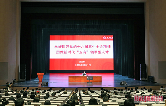 12月1日下午,校党委书记刘正东以《学好用好党的十九届五中全会精神勇做新时代“五有”领军型人才》为题,在汇学堂我校师生讲授了一堂精彩的形势与政策课。beats365(中国区)-唯一官方网站组织750多名新生、全体辅导员在第六教学楼五个分会场观看报告会直播,学院主要领导、师生代表主会场汇学堂参加报告会