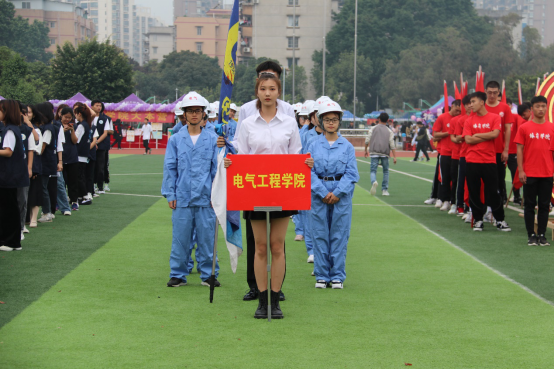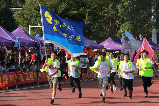 墨色淡云晕染天边,当轻柔晚风拂过西体育场,第五十届校运会慢慢落下帷幕。闭幕式上,电气学院的代表们身穿院服,踏着整齐激动的步伐,环绕着赛场,展示灵动的旗海与青春的自信