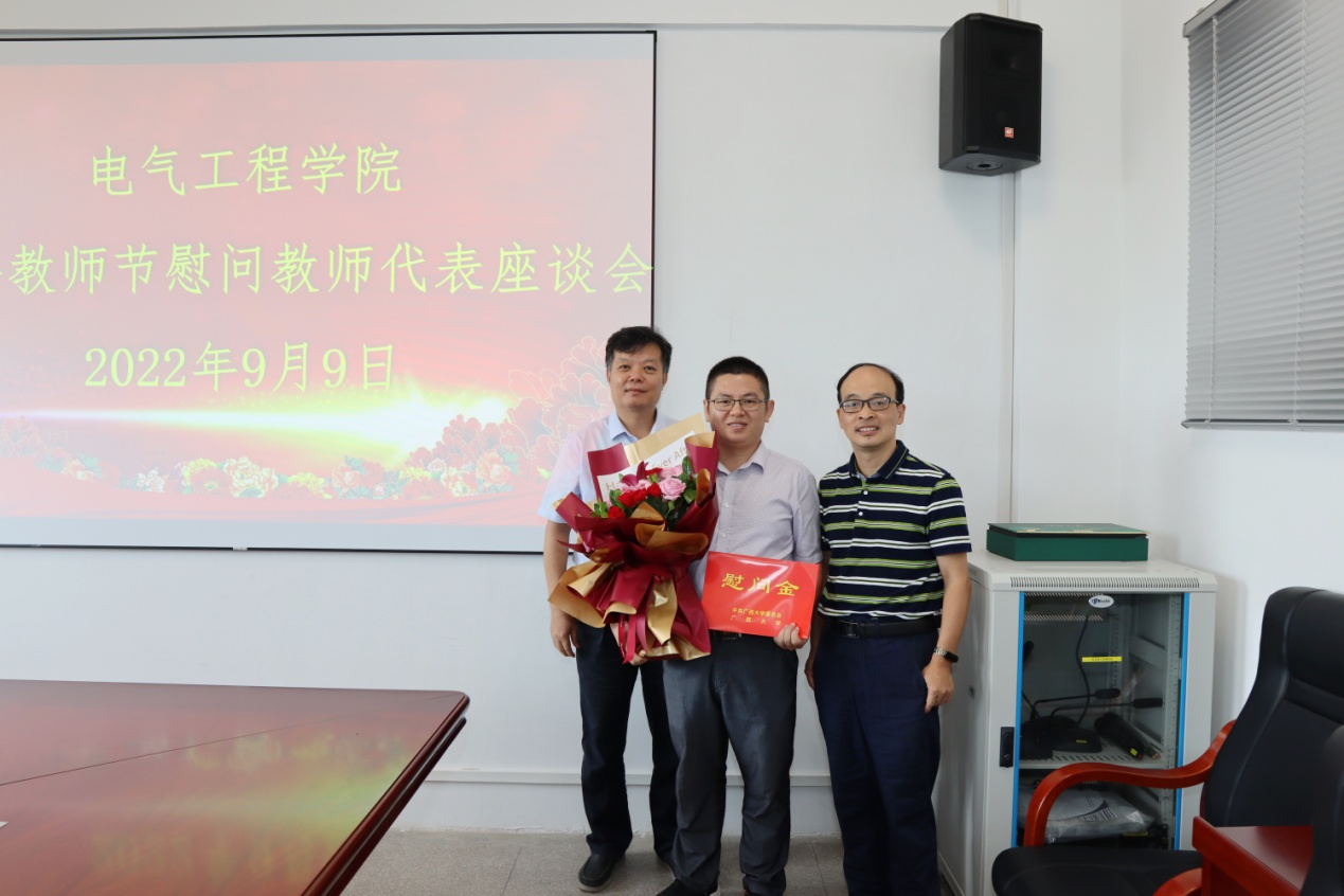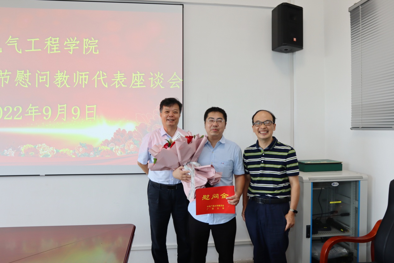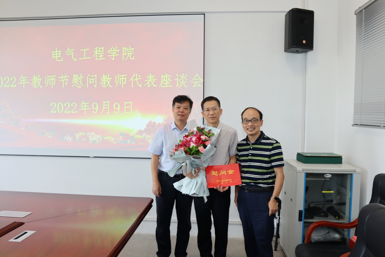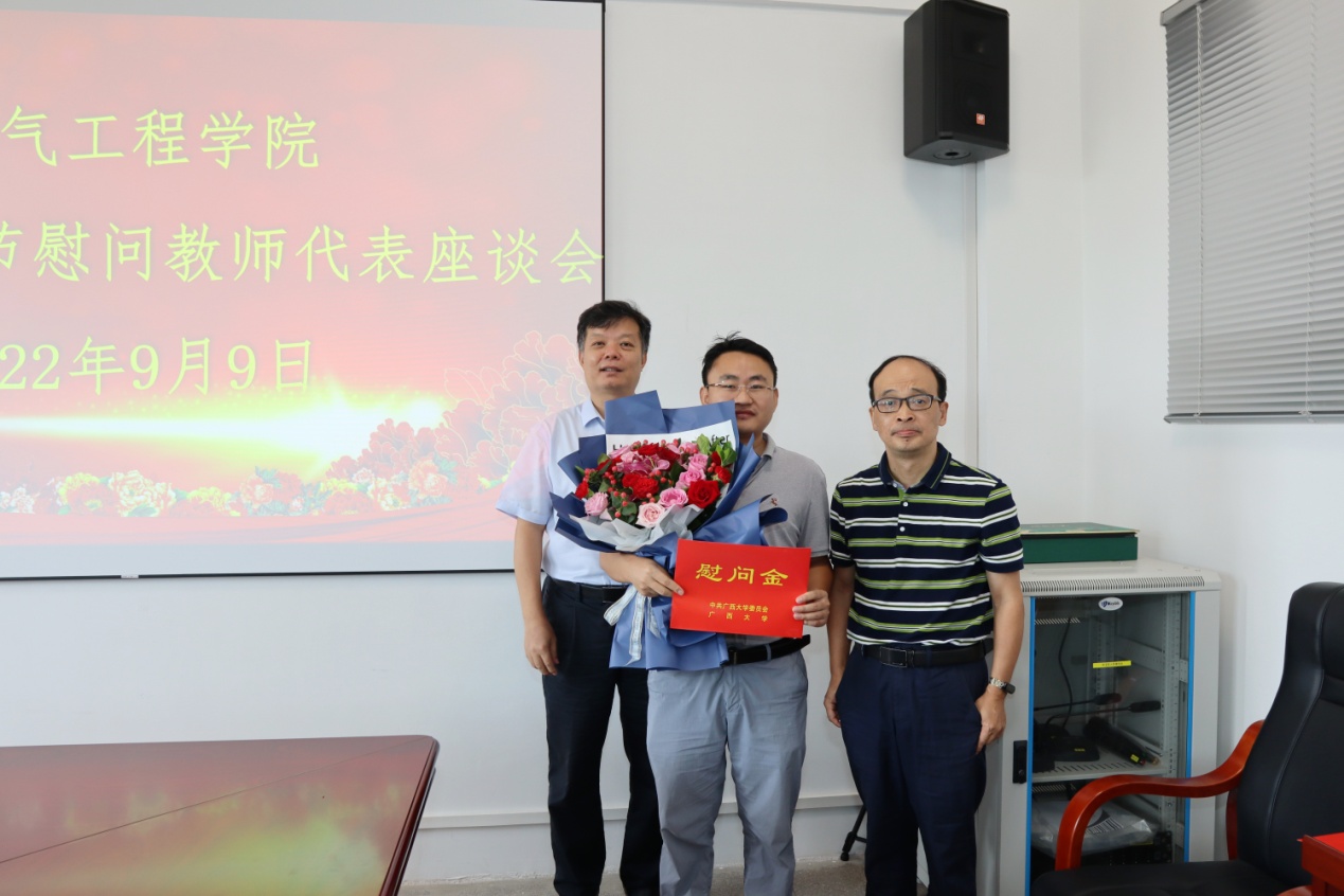 座谈开始前,院党委书记梁志坚、院长双丰给教师代表送花和发放慰问金。党委副书记雷圆媛、副院长胡立坤、副院长于婷及各系(教研室)主任参加了慰问活动。