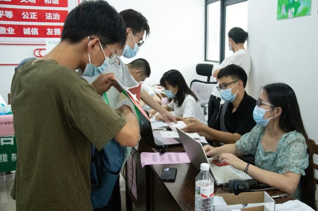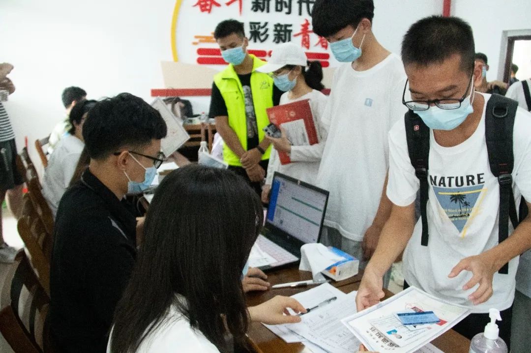 这里有身穿荧光绿志愿服、戴着口罩的志愿者,他们协助新生有序顺利完成报到流程。他们热情接过新生手中的行囊,引导每一位新生到相应的报到点办理手续。