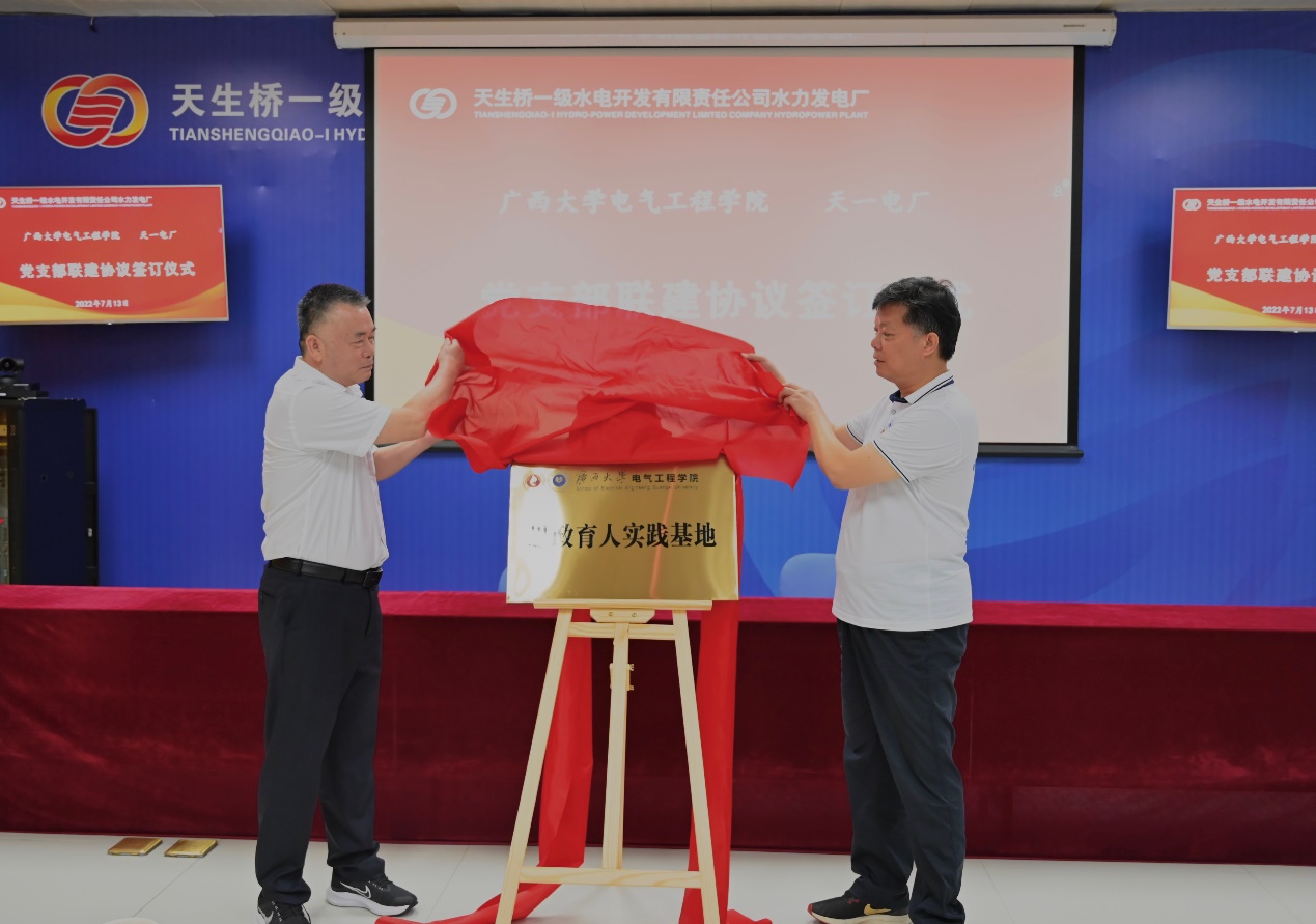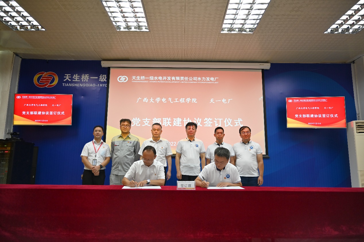 在天一电厂,广西大学beats365(中国区)-唯一官方网站电气党支部与天生桥一级水电开发责任公司水力发电厂党支部举行党支部联建签约仪式和揭牌仪式。两个党支部充分发挥各自的优势和特点,在党建工作框架下开展人才培养、科研合作、实习实践、文化建设等活动,促进基层党建工作特色化、制度化。社会实践团观看了天一电厂成立20周年宣传片,在厂房学习和实践,了解企业发展历史和“卓越之道,天人合一”的企业文化,学习天一电厂支部建设先进经验与企业管理的创新做法。