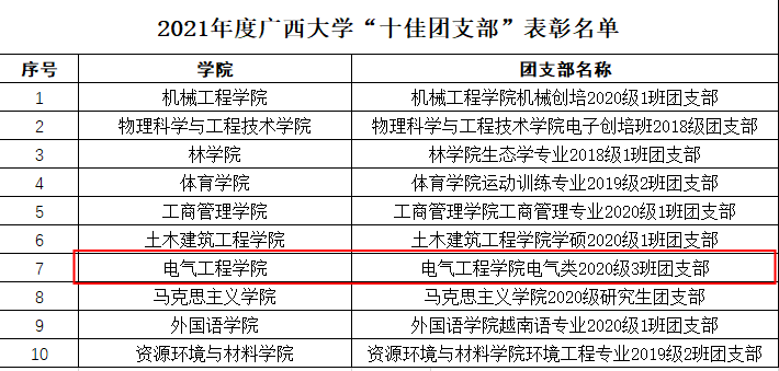 电气类2020级3班团支部荣获2021年度广西大学“十佳团支部”称号