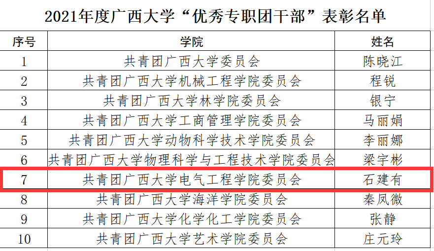 我院团委书记石建有荣获2021年度广西大学“优秀专职团干部”称号
