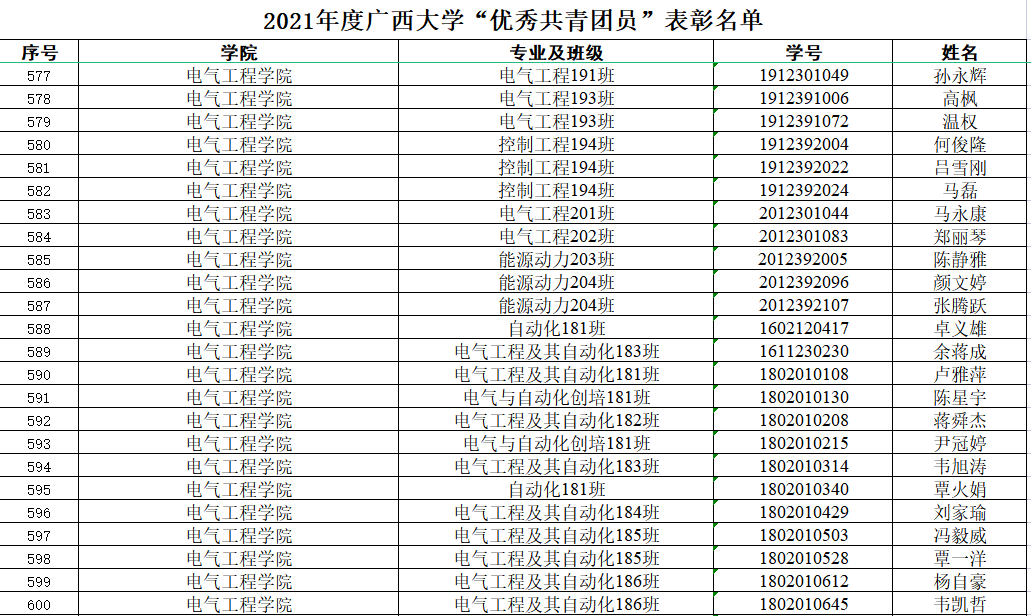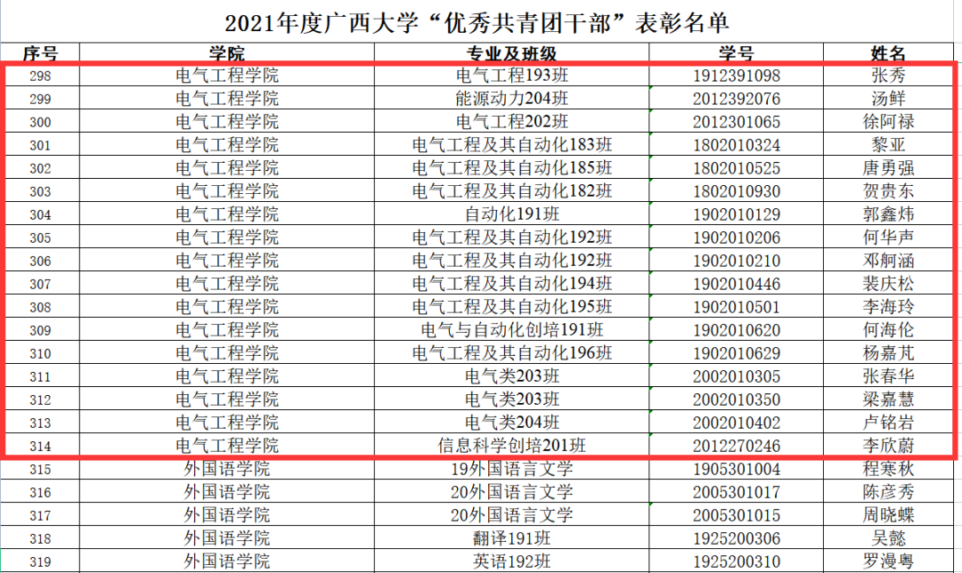 我院47位表现优秀、工作成绩突出,能起到带头作用的共青团员获得2021年度广西大学“优秀共青团员”荣誉称号。