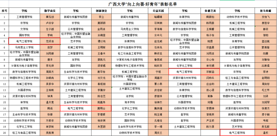 “向上向善·好青年”是一批带头践行社会主义核心价值观、积极传播正能量、道德情操高尚并富有开拓精神青年榜样。我院4名同学获得广西大学“向上向善·好青年”荣誉称号,其中: