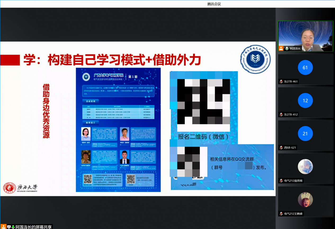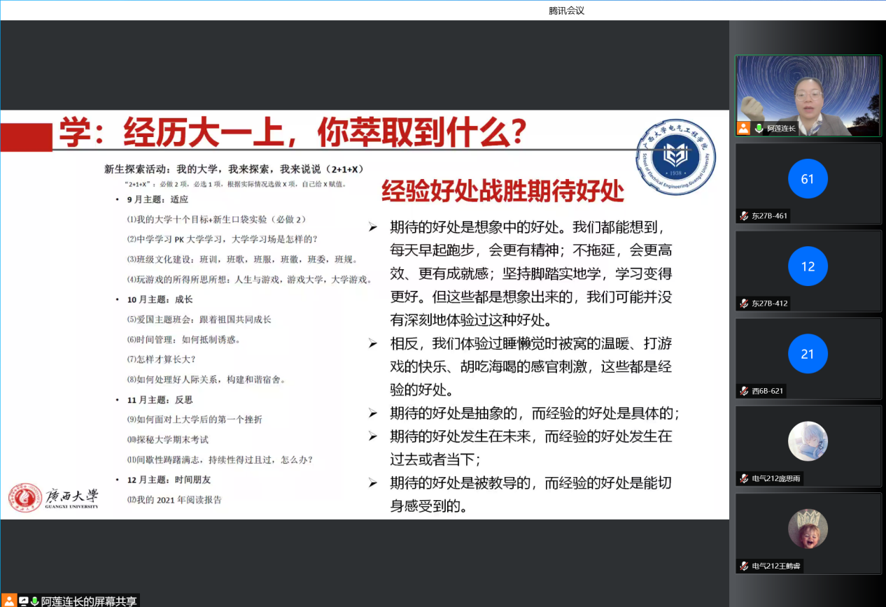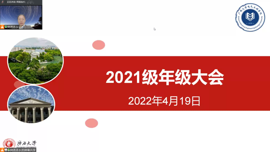4月19日下午,广西大学beats365(中国区)-唯一官方网站以视频会议的方式召开2021级本科生年级大会。学院党委副书记雷圆媛出席会议并讲话,年级大会由团委副书记蒋冬连主讲,2021级全体本科生参加会议。