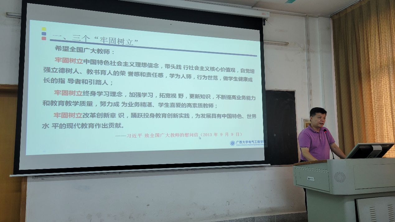 院党委副书记梁志坚作师德师风专题教育,强调师德师风是评价教师队伍素质的第一标准。对习近平总书记关于师德师风的重要论述,“四史”学习教育资料和新时代师德规范等进行了解读,以师德优秀典型为榜样引领践行高尚师德,以师德警示教育案例强化职业行为准则意识。此外,梁副书记还介绍了学院的纪委工作,监督推进全面从严治党、加强党风廉政建设。