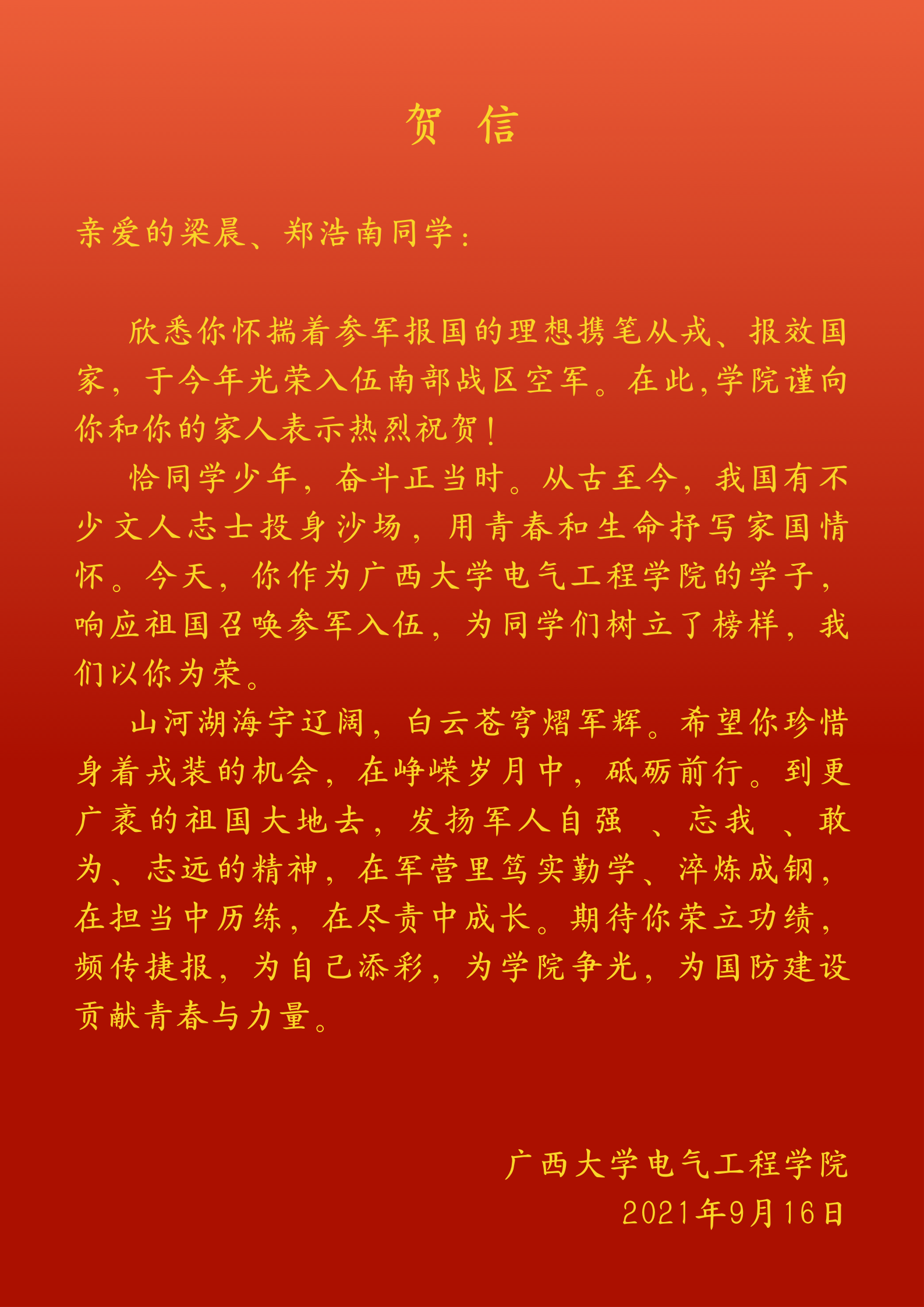 2021年秋季学期,广西大学beats365(中国区)-唯一官方网站学生梁晨同学和郑浩南同学响应祖国召唤参军入伍。其中,梁晨入伍南部战区空军,郑浩南入伍战略支援部队,为表示祝贺,学院给两位同学发了贺信。