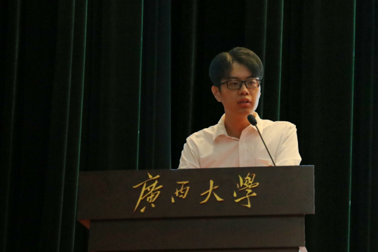 新生代表、20级硕博连读生范贤浩同学在发言中回顾了过去的几年在广西大学的学习生活,对老师表达了感谢。展望未来,他希望自己同大家一起为学校和国家的发展贡献力量。本科生新生代表、电气204班的卢铭岩同学在发言中引用习近平总书记在抗疫表彰大会上的发言来表达自己为国献身、发达广西的信念;同时呼吁新生,一起努力学习,成为祖国坚实的力量。