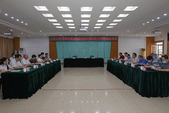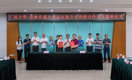 6月5日下午,我院主持的广西大学与北海玖嘉久食品有限公司“鱼籽福袋智能化自动生产线的研制”科研合作项目合同签约仪式在君武馆举行。签约仪式由广西大学校地合作处处长黄祖强主持。