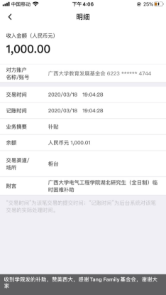 春风送暖,西大校友用爱传递力量,传递希望。疫情发生以来,广西大学beats365(中国区)-唯一官方网站严格做好学院疫情防控各项工作,也切实做好受疫情影响学生的兜底保障工作,织密织牢社会安全网。近日,经学院党委研究、提议并征得Tang Family基金会唐总的同意后决定:从电气学院校友捐款设立的“Tang Family奖学金”中拿出 7.2 万元,用于资助电气学院湖北籍学生及新冠肺炎确诊的学生,帮助他们缓解疫情防控期间面临的经济压力。