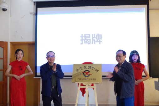 紧接着,院长双丰教授和党委书记梁京章教授分别发表热情洋溢的讲话,表达了对众创空间的期望与祝福,希望学生众创空间能够成为我院学生创新创业的一个大舞台,提高我院创新创业工作水平,同时也希望专任教师和实验教师积极关注各学生专业组织的发展,积极为学生专业组织的发展提供指导。梁书记和双院长一起为“广西大学beats365(中国区)-唯一官方网站学生众创空间”揭牌。