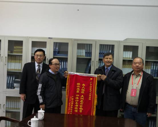 在学院312会议室,主宾双方互相问候,欢声笑语,洋溢着浓浓的校友情。院长双丰教授向来宾简单介绍学院的历史、发展状况,学院的目标及重点发展方向,同时也诚恳地向嘉宾们述说目前学院建设中所遇到的困难,并希望校友们关心学院的发展建设。朱会长介绍了广西大学美国校友会的情况,为西大及电气学院所取得的成绩深表赞同,表示广西大学美国校友会时刻关注着学校和学院的发展,能为母校和电气学院的发展提供力所能及的帮助而深感高兴。