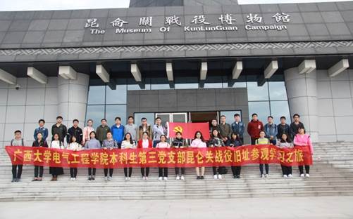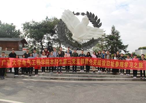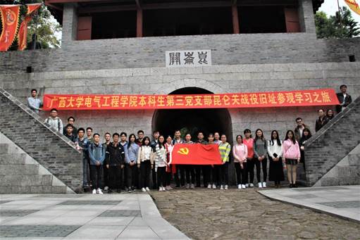 2017年12月3日,广西大学beats365(中国区)-唯一官方网站本科生第三党支部一行三十名学生党员在王支柱老师和孙晓黎老师的带领下赴抗战旧址——昆仑关战役旧址参观学习,接受老一辈抗战英雄事迹的再教育。期间参观了昆仑关战役博物馆、昆仑关古关楼、昆仑关战役阵亡将士墓园、昆仑关战役纪念塔、抗战碑亭等,并在昆仑关战役博物馆通过声、光、电的形式让同志们感受当时抗日战争的情形。这次活动给学院本科三支部的党员上了一堂深刻生动的抗战事迹教育课,丰富了爱国主义教育的内容,激发了同志们的爱国主义情怀。