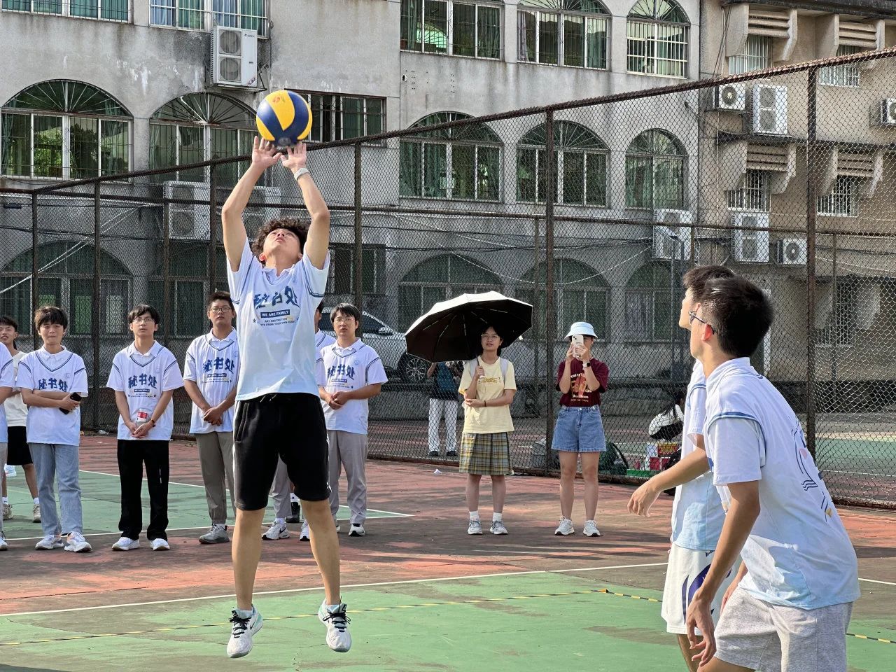 击球,传球,扣球,得分,比赛现场的欢呼声震耳欲聋,鼓舞声响彻云霄,各位选手拼尽全力,激烈的角逐,一招一式,精彩纷呈,带动现场的气氛进入高潮。老师也积极的加入其中,与同学们并肩协作,在场上挥洒汗水,展现体育带来的激情与活力,为比赛增添了一抹靓丽的色彩。