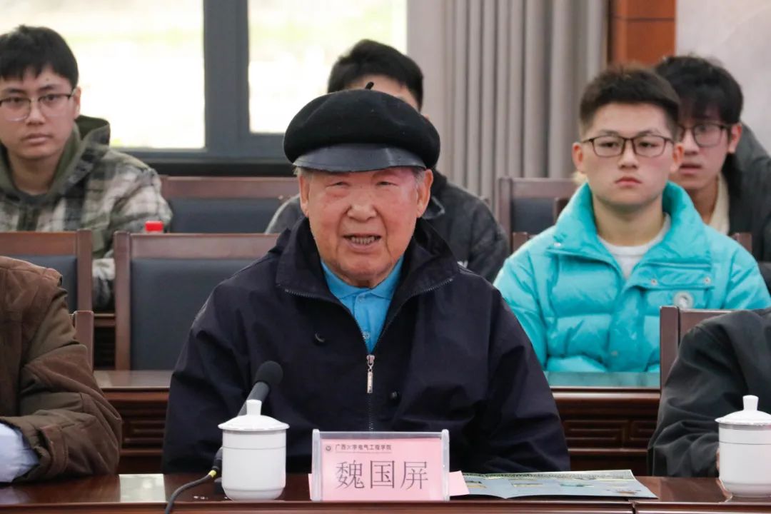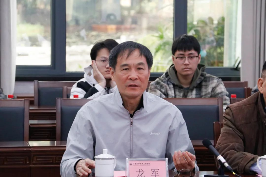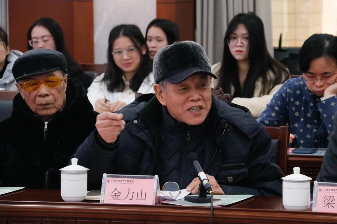 在座谈进行中,学院74级校友,原广西科协党组书记甘向群同志因故不能与会,委托学院领导宣读了他写给唐教授的感恩肺腑之言;播放了华中科技大学退休老教师陈德树教授和浙江大学电气学院的周浩教授发来视频,讲述他们各自与唐兴祚教授在工作中交往的经历,并表达了对唐教授深切的缅怀。