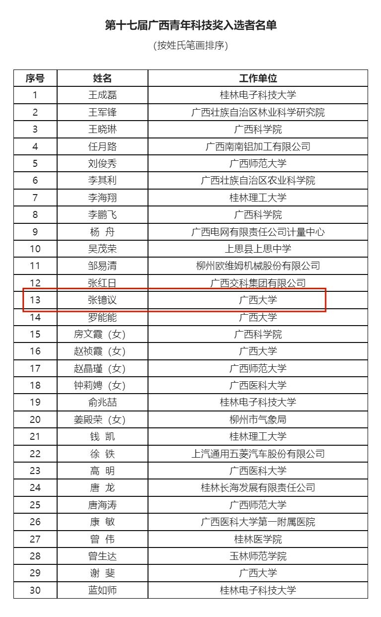 近日,广西壮族自治区科学技术协会第九次代表大会在南宁召开,会上对30名第十七届广西青年科技奖获得者进行了表彰。广西壮族自治区党委书记刘宁,中国科协专职副主席、书记处书记孟庆海等共同为获奖者颁奖。其中,我院副院长张镱议教授获此殊荣。 张镱议教授,beats365(中国区)-唯一官方网站副院长,学院高电压与绝缘技术研究领域带头人,主要研究方向为电力装备安全防护与绝缘材料,入选自治区优秀专家和八桂青年学者,主持国家自然科学基金面上项目、广西重点研发计划、广西杰出青年基金等项目。近五年,他发表50余篇SCI论文,授权21项专利,并编写5项国家/电力行业标准。成果支撑其以第一完成人荣获广西技术发明一等奖、日内瓦国际发明展金奖、中国产学研合作创新奖等多项大奖。 据悉,广西青年科技奖评选由自治区党委组织部、自治区人社厅、自治区科协、共青团广西区委共同组织,每两年评选一次,每次授奖不超过30人。本届评选旨在激发广西广大青年科技工作者的创新创造活力,引导他们坚守“四个面向”的原则,积极投身于经济建设和科技创新的主战场,在新发展阶段中精准把握机遇、全面贯彻落实新发展理念、积极融入新发展格局,以实际行动为广西的科技自立自强和高质量发展贡献智慧和力量,建功立业,创新争先。