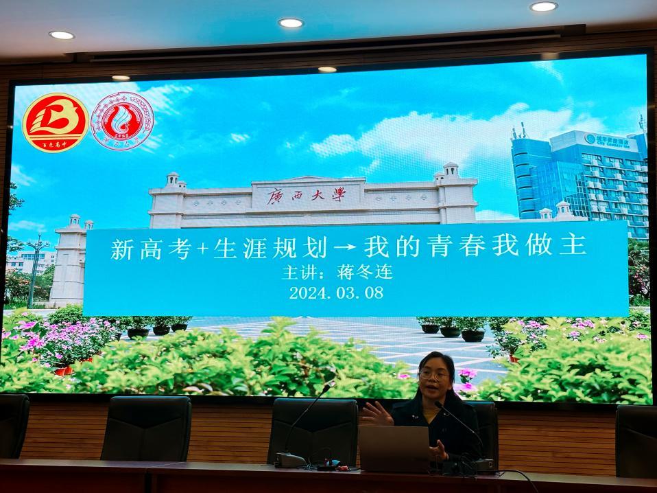 与企业的交流结束后,我院一行在百色高中举行了职业生涯规划指导讲座。学院团委副书记蒋冬连老师作为主讲人,给百色高中2021级四百多名高三年级学生做题为《新高考+生涯规划→我的青春我做主》的讲座。她从高考综合改革概况、“生涯规划+志愿填报”的融合、我的青春如何由我做主等多方面展开宣讲,同时结合广西大学特色和优势宣传广西大学,受到在场学生的热烈欢迎,现场气氛活跃。