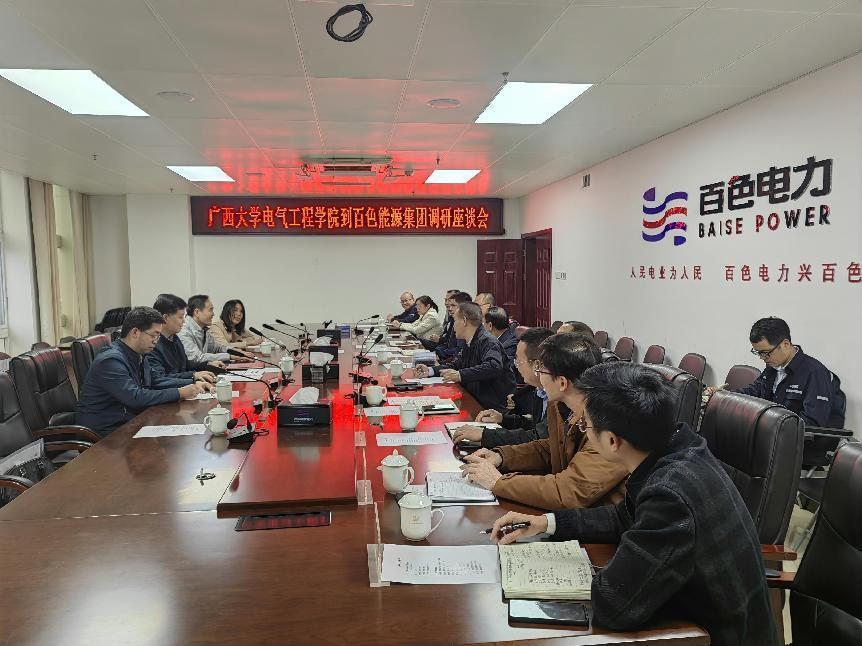 我院86级校友百色能源集团总裁黄建成首先对母校老师一行的到来表示热烈欢迎 ,他详细介绍了集团的运营情况和业务发展,并强调目前百色能源集团1/5员工来自广西大学。结合公司发展情况,他希望广西大学beats365(中国区)-唯一官方网站能应对电网数字化转型形势,培养更多具有信息通信和大数据处理专业能力的复合型电气人才,也期待更多广西大学毕业生加入百色能源集团。学院副院长李畸勇表示今后将调整本科生培养方案、改进专业课程设置,适应建设新型电力系统的要求。