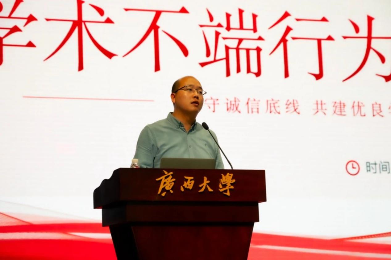 学院党委副书记兼纪委书记李道洋就“常充廉洁电,远离高压线”的主题,为全体硕博研究生进行了学术诚信教育。李道洋书记郑重提醒同学们,研究生阶段,必须严格恪守学术诚信,不得有任何形式的学术不端行为。他强调,同学们要共同维护学术诚信的底线,积极营造严谨、清洁的学术风气。科学研究并非有捷径可走,唯有秉持“‘实事求是、勤奋钻研”的精神,方能撰写出真正具有学术价值的论文。