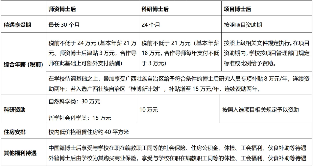 在学校待遇基础之上,叠加享受广西壮族自治区给予符合条件的博士后研究人员专项补贴8万元/年,连续资助两年;若入选广西壮族自治区“桂博新计划”,补贴增至15万元/年,连续资助两年。