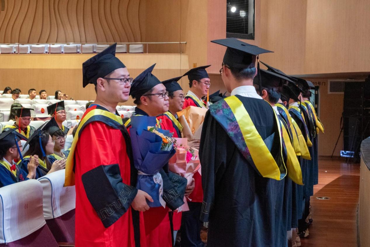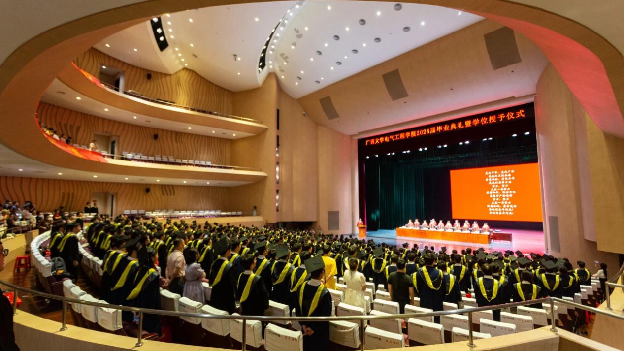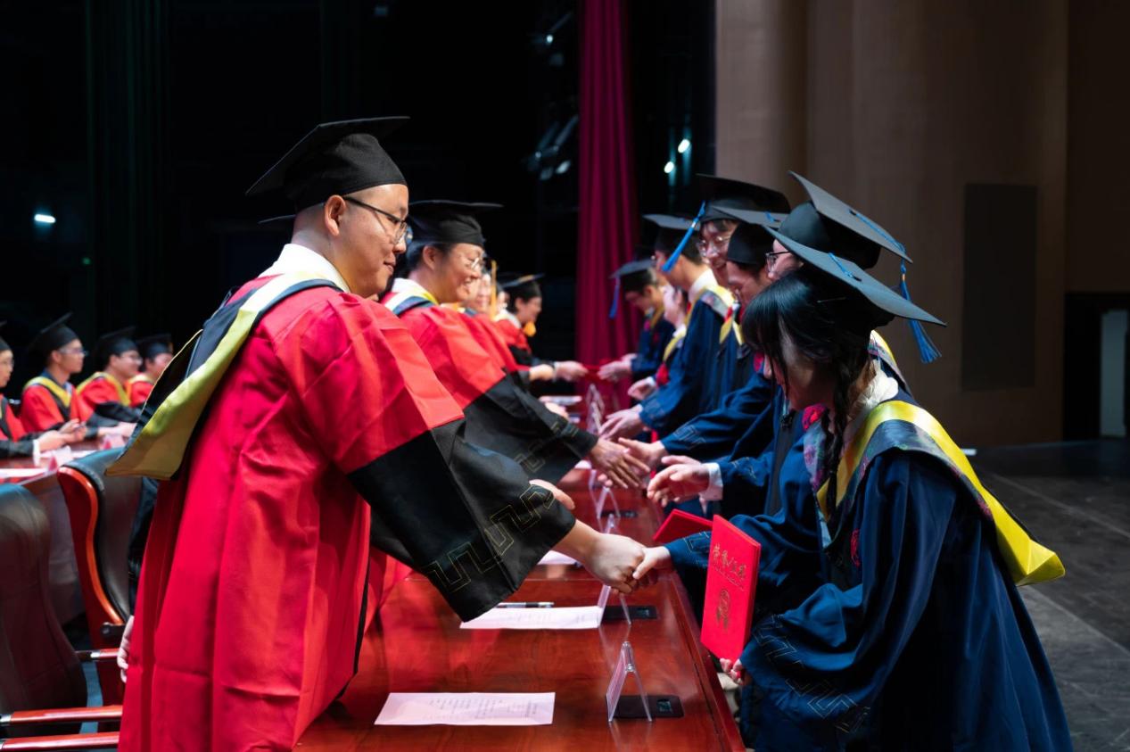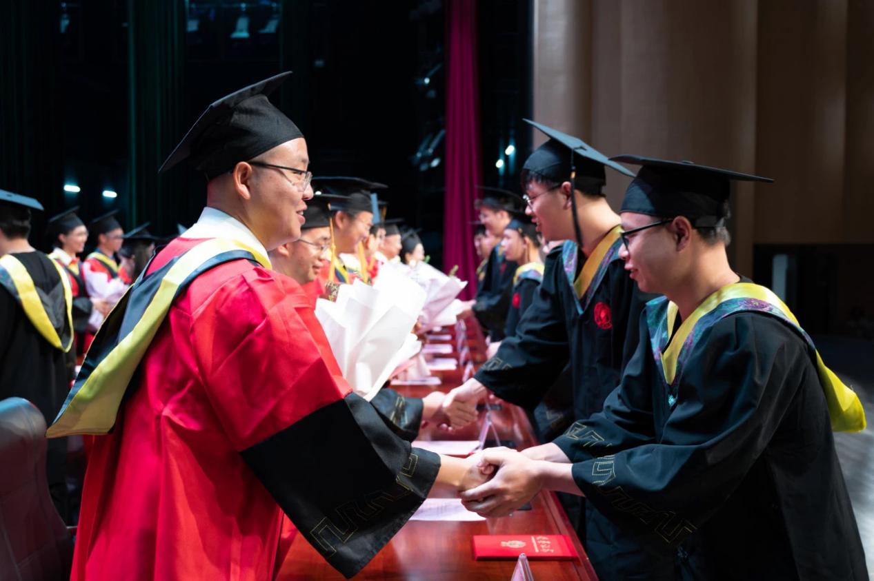在热烈的气氛中,梁志坚书记,武新章院长,刘辉副书记、副院长,黎静华教授,胡立坤教授,张镱议教授,李畸勇副院长为2024届博士毕业生、硕士毕业生、本科毕业生授予学位,毕业生们分批上台接受拨穗并合影留念。