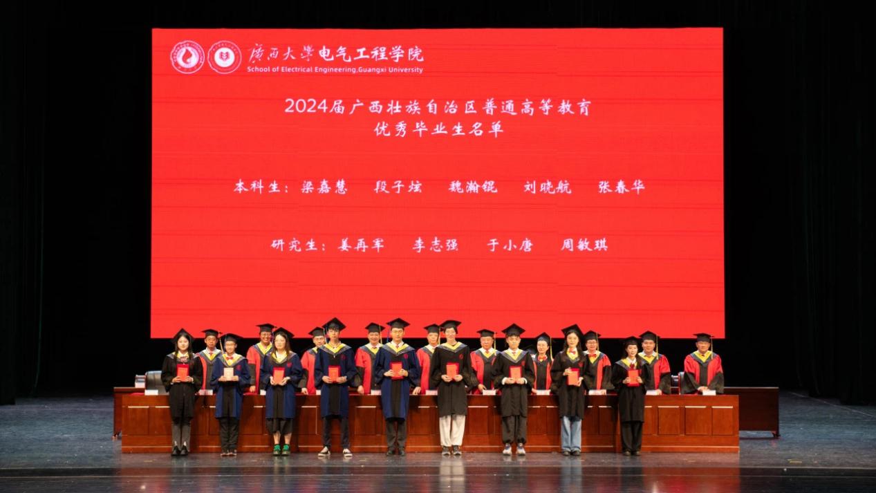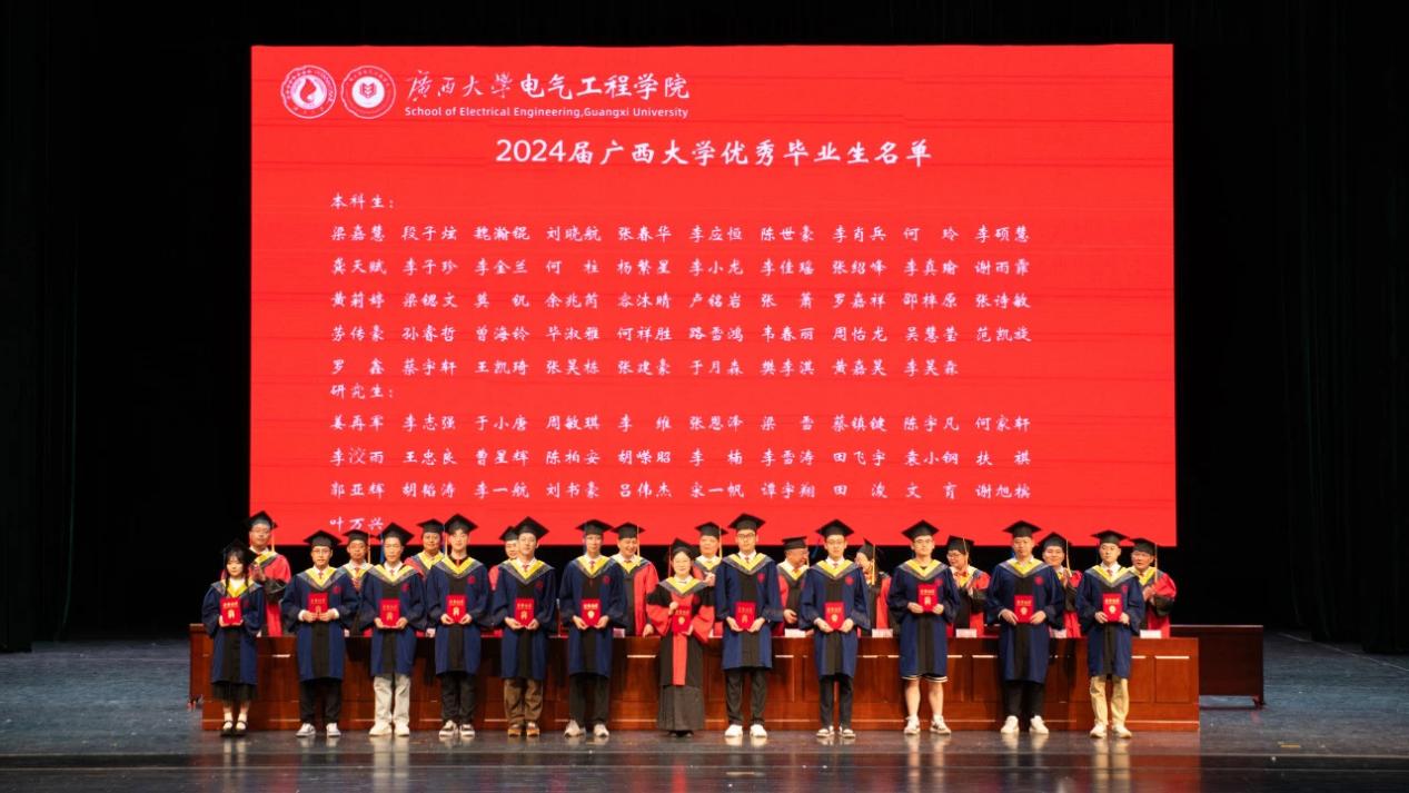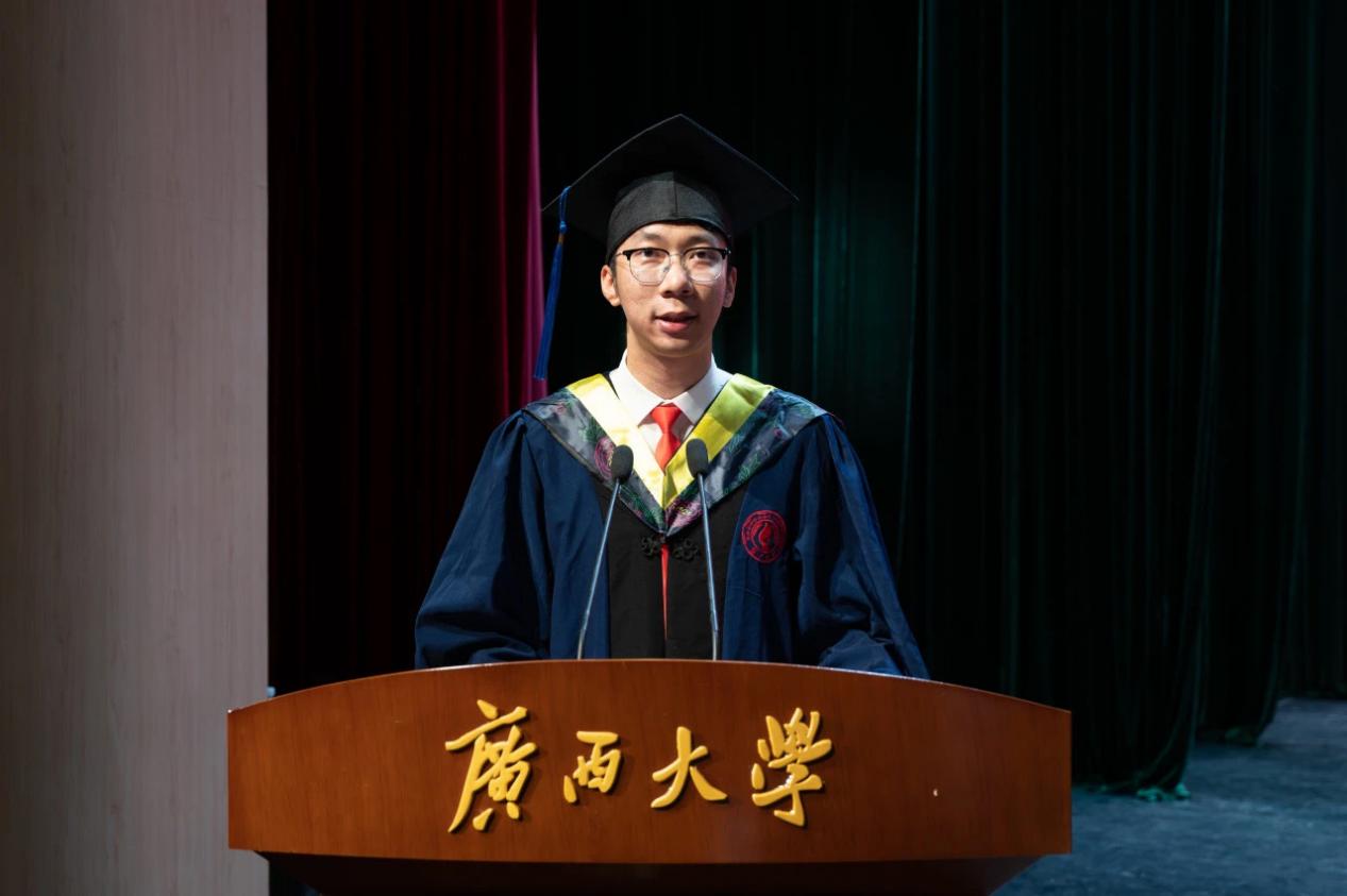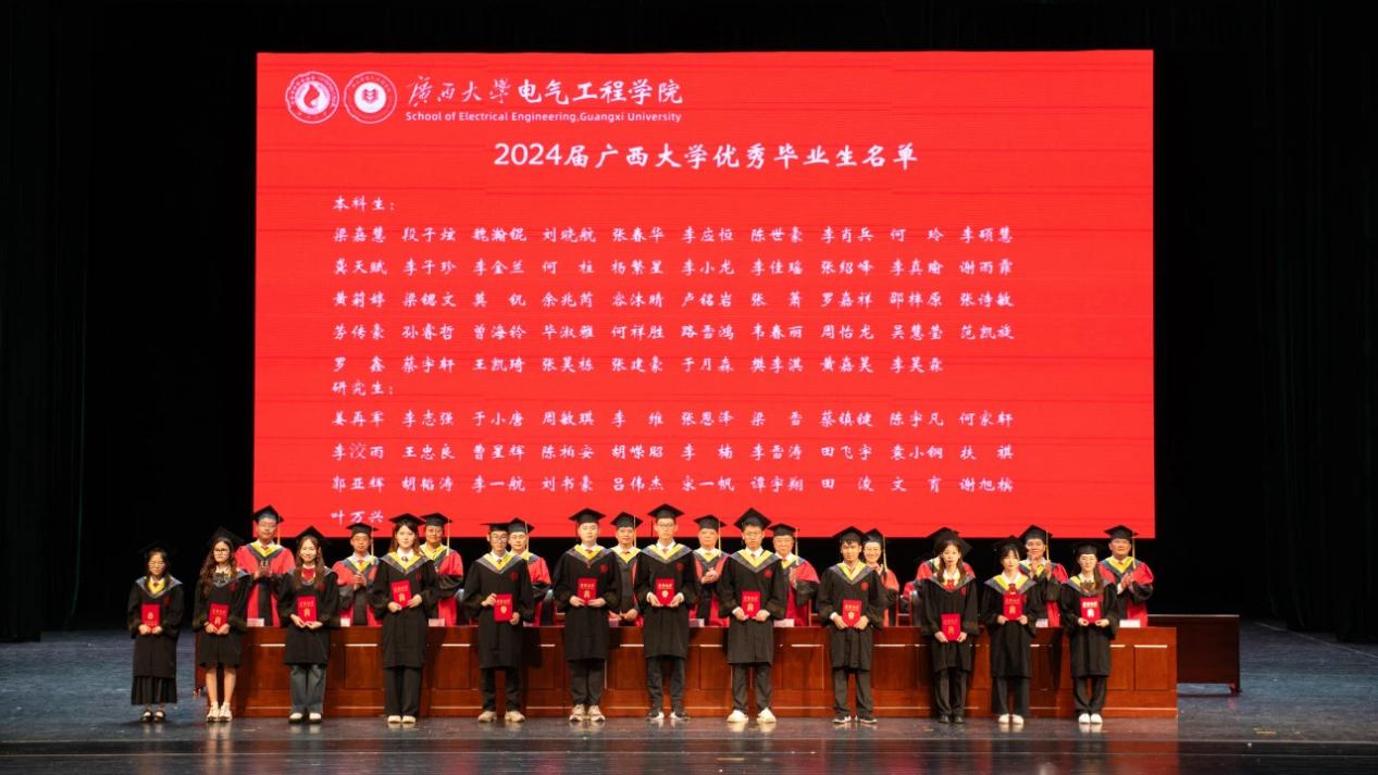 院党委书记梁志坚宣读2024年学位授予文件以及自治区级、校级优秀毕业生表彰文件,学院领导老师为获得“广西壮族自治区优秀毕业生”“广西大学优秀毕业生”的学生代表颁发证书。