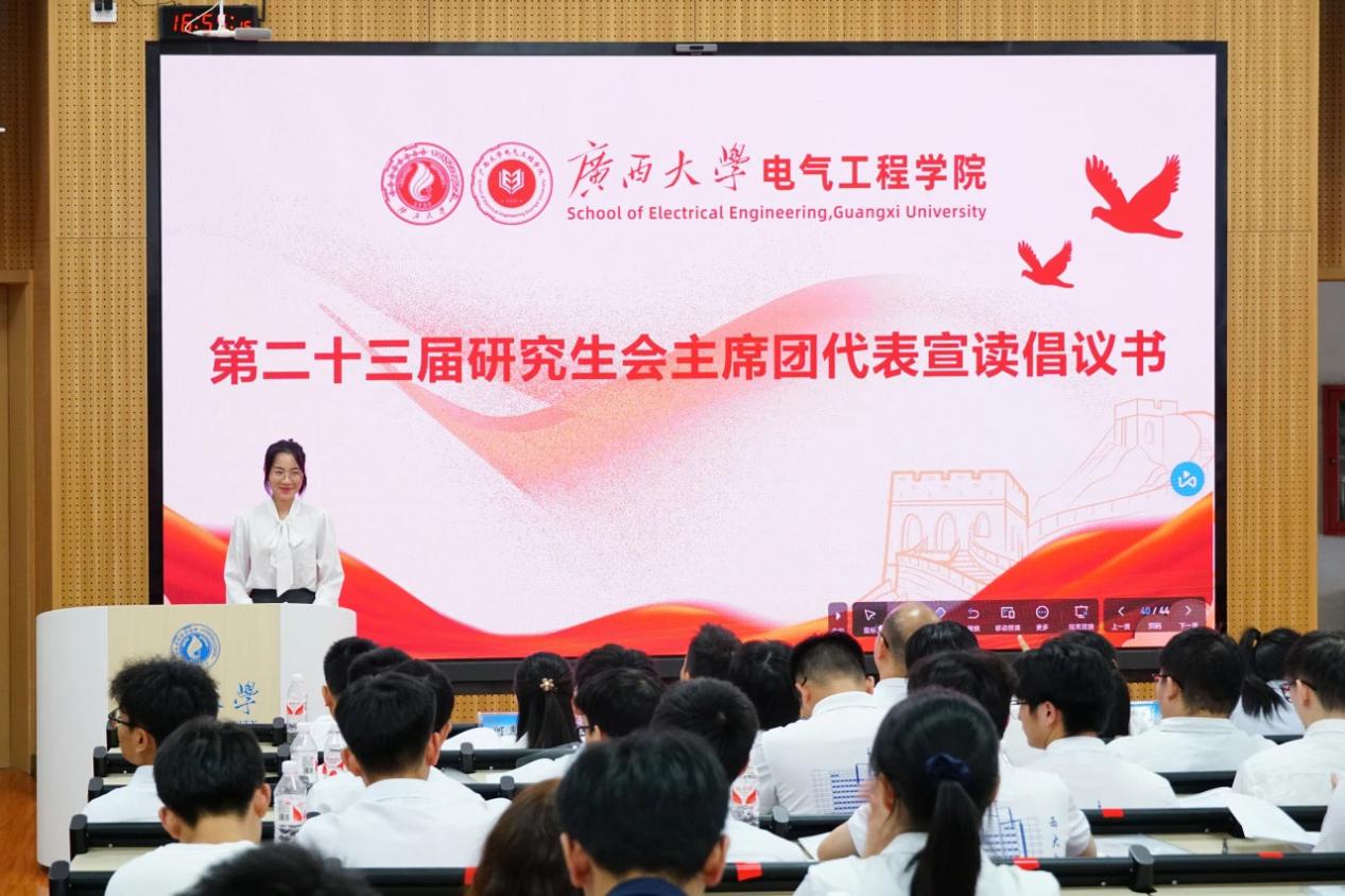 大会选举出的第二十一届研究生主席团成员莫书琴以大会的名义向全院同学发出倡议:第一,坚定理想信念,争当时代先锋。第二,掌握真才实学,练就过硬本领 。第三,锤炼品德修为,担当家国大任。