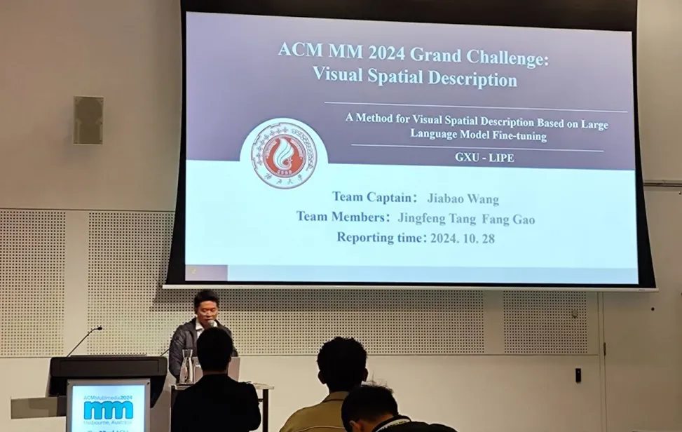 GXU-LIPE团队由高放教授和课题组研究生王家宝、唐镜峰组成。团队受邀撰写了论文《A Method for Visual Spatial Description Based on Large Language Model Fine-tuning》发表在第32届ACM国际多媒体会议,并前往墨尔本进行口头报告。