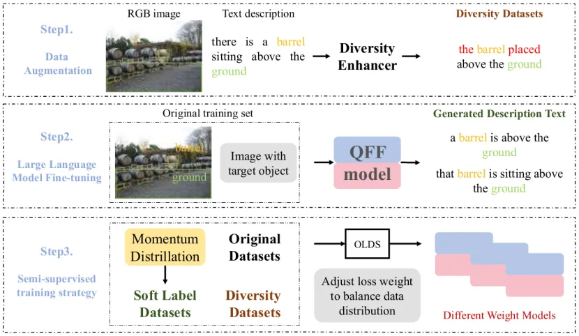 GXU-LIPE团队设计了一种创新的基于大模型的方法,通过微调大语言模型FLANXXL提升了视觉空间关系描述的效果。首先通过预训练模型提取图像特征和文本特征,然后采用Q-former进行特征融合,最终通过大语言模型输出文本描述。为解决LLM特征捕获困难的问题,将原始特征与融合后的特征一并输入FLANXXL,并采用数据增强、先验知识和多种训练策略等进行微调,具体包括提升文本多样性、引入对象重叠先验、基于动量蒸馏筛选难负样本及生成软标签,基于权重平衡长尾数据等。通过多模态特征融合和微调,模型在挑战赛测试集上表现优异,生成了准确且更真实的对象空间关系描述文本。