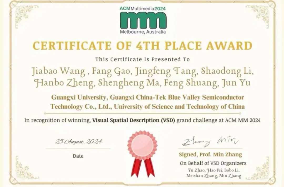 近日,第32届ACM国际多媒体会议在澳大利亚墨尔本落下帷幕。该会议由美国计算机学会(Association for Computing Machinery,简称ACM)主办,同时其主办的视觉空间描述重大挑战(Grand Challenge: Visual Spatial Description,简称VSD2024)公布竞赛结果并颁发获奖证书。我院广西电力装备智能控制与运维重点实验室高放教授带领的GXU-LIPE团队荣获挑战赛第四名,同时受邀撰写论文并进行口头报告。