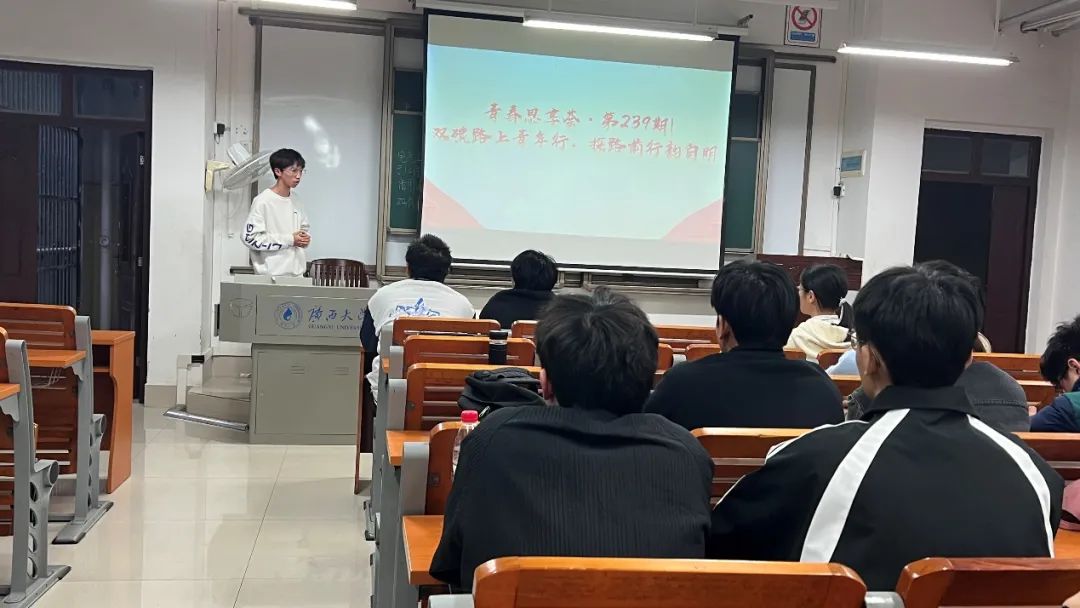 为深入学习贯彻习近平总书记关于碳达峰碳中和工作的重要论述,帮助青年学子理解习近平新时代中国特色社会主义思想对我国生态文明建设的重要影响,12月17日,我院在六教108教室开展了“‘碳’路青年,共筑未来”主题青春思享荟沙龙。本次活动由共青团广西大学委员会主办,学院团委承办,院学生会策划开展。 分享会上,与会成员深入学习了习近平总书记关于碳达峰碳中和工作的重要论述,并集体观看了“推动实现‘双碳’目标,书写绿色发展答卷”的新闻联播短片。大家认识到,党的十八大以来,以习近平同志为核心的党中央深刻把握生态文明建设在新时代中国特色社会主义事业中的重要地位和战略意义,创造性地提出一系列新理念新思想新战略,形成了习近平生态文明思想,为新时代生态文明建设、绿色低碳发展提供了根本遵循和行动指南。 本期青春思享荟紧密衔接学院团委“‘双碳’路上青年行,探路前行韵自明”主题团日活动。作为主题团日活动的参会学生代表,沈鑫同学结合自身的专业知识,分享了自己对“双碳”目标的理解,包括绿色电力、广西绿色发展目标等双碳相关知识。龚旭彪同学也分享了自己的心得,他呼吁大家从点滴做起,勇于创新,用所学专业知识助力能源转型和绿色发展,以实际行动展现青年的责任与担当,在“双碳”征程中彰显青春的价值。 沈鑫同学在分享参会心得 通过这次青春思享荟的深入交流与思想碰撞,同学们不仅增强了个人对生态文明建设和“双碳”目标重要性的认识,更激发了大家将理论知识转化为实际行动的决心与力量。青年是国家的未来,民族的希望,面对新时代赋予的使命与挑战,电气青年学子当以更加饱满的热情、更加坚定的信念,投身于生态文明建设的伟大实践中,用实际行动践行绿色发展理念,为构建美丽中国贡献青春力量。
