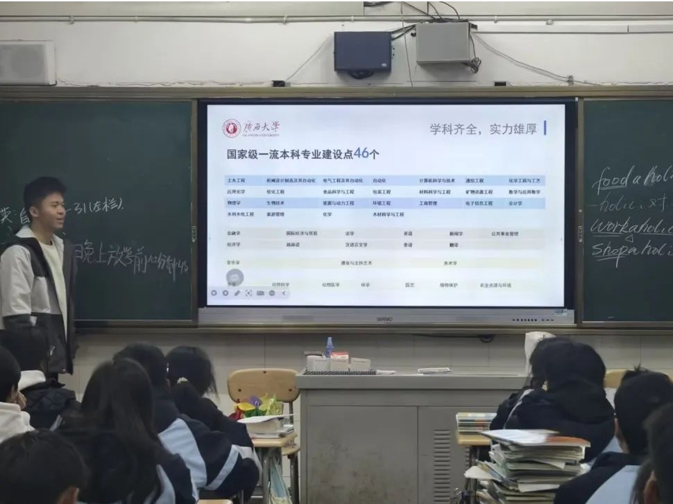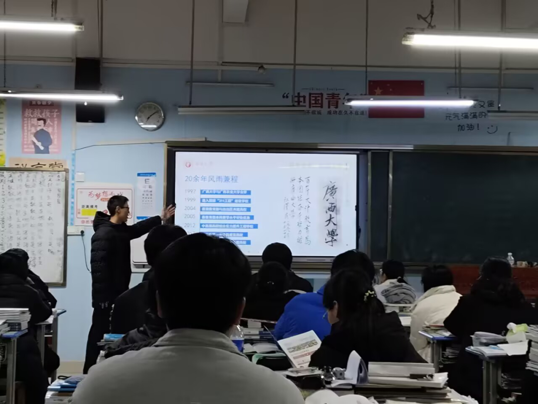 电自245班温曜旭回到了高中母校,开展广西大学招生宣传活动。作为活动负责人,他设立了风雨棚宣讲点,解答高三学子的各类疑问;深入班级宣讲,分享大学生活与专业信息,激发同学们对未来的憧憬。他期盼更多学弟学妹报考广西大学,共谱人生新篇,并决心持续为招生宣传助力,圆更多学子梦想。