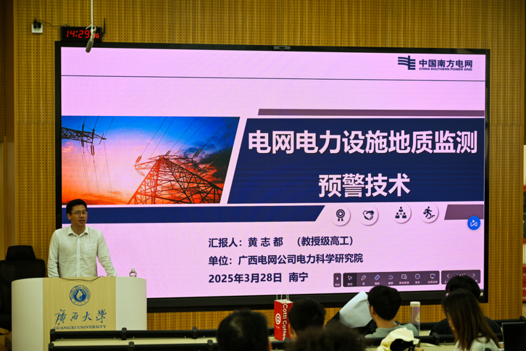 为提升我院学生工程应用与实践能力,了解当下科研工作前沿,助力其成长成才,3月28日下午,我院在东10A-305教室举行第7期“行业大咖进课堂”暨电气工程学科前沿讲座。广西电网公司电力科学研究院教授级高工黄志都受邀到我院为师生们作题为“电网地质灾害监测预警技术”的讲座,我院2024级电气工程专业全体博士、硕士及部分本科生共250余人参与讲座。 黄志都高工正在授课 讲座伊始,黄志都高工从电网输电通道周边地质灾害情况切入,迅速吸引了同学们的注意力。随后,他讲述了基于北斗卫星和微波遥感(InSAR)两种技术手段的应用方法,此方法能同时按照“单体监测、广域监测”两种尺度实现输变电设施地质灾害大范围探测、小范围监测立体化监测预警体系,并能够实现三维可视化展示。 黄志都高工介绍电网地灾情况 其中,InSAR遥感监测技术的特点在于设计了输变电设施地质灾害监测系统的架构,包括北斗实时单体监测、遥感InSAR局域监测和输电杆塔三维可视化这三大基本模块。黄志都高工结合广西电网历史地质灾害情况,向同学们深入讲解了InSAR遥感监测的具体应用案例,并清晰地展现了InSAR遥感监测手段能够针对每个遥感点生成不同颜色的标识,以及相关地形变化数据和曲线。 同学们认真听课与做笔记 此次讲座不仅拓宽了同学们的学术视野,激发了同学们对前沿技术的浓厚兴趣和深入探索的动力。同时,黄志都高工关于实践经验与行业洞察的分享,也为同学们未来的职业规划提供了宝贵的指导和启发。未来,学院将继续开展“行业大咖进课堂”系列活动,通过持续深化校企合作课程体系建设,推动产学研协同发展,共同打造科技创新与高素质人才培养的双赢格局。