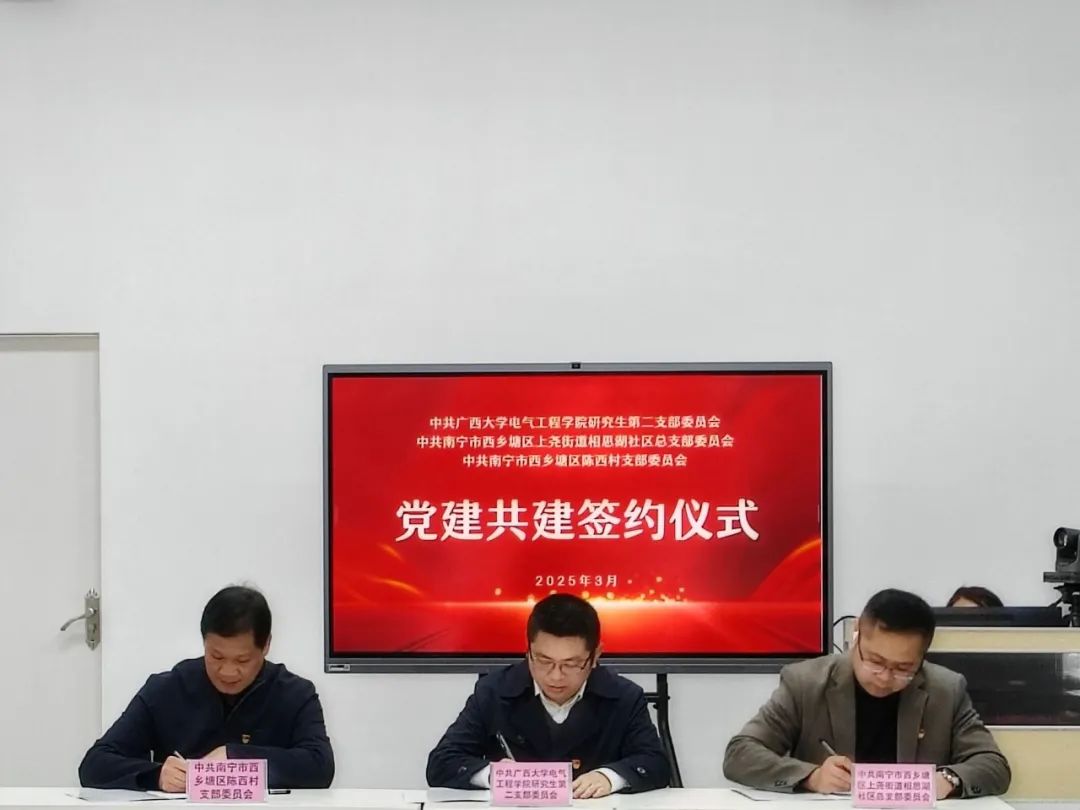 2025年3月5日,我院研究生第二党支部(以下简称“电气研二支部)赴相思湖社区,参加上尧街道举办的“社校联村,服务添能”党建品牌建设会议,与相思湖社区党总支、陈西村党支部签订三方合作共建协议。