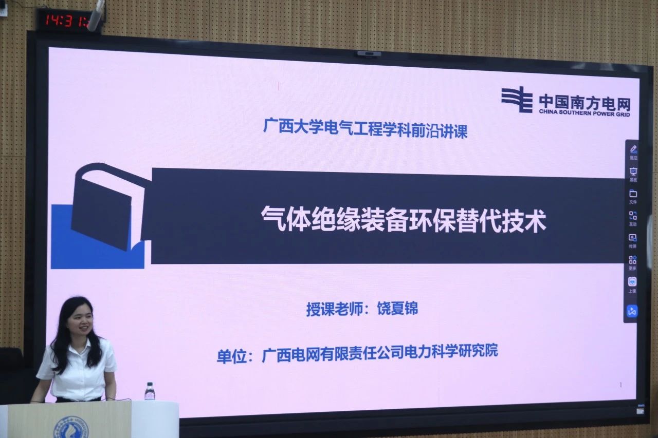 随后,饶夏锦工程师向同学们介绍了六氟化硫管控与气体减排技术的发展现状,向同学们深入讲解了其回收处理的流程和成果,并介绍了混合其他气体使用的成果与现状,用自己的成果深入浅出地介绍了现有的各类新型环保绝缘气体;最后对绝缘气体领域的发展趋势与挑战进行了展望。
