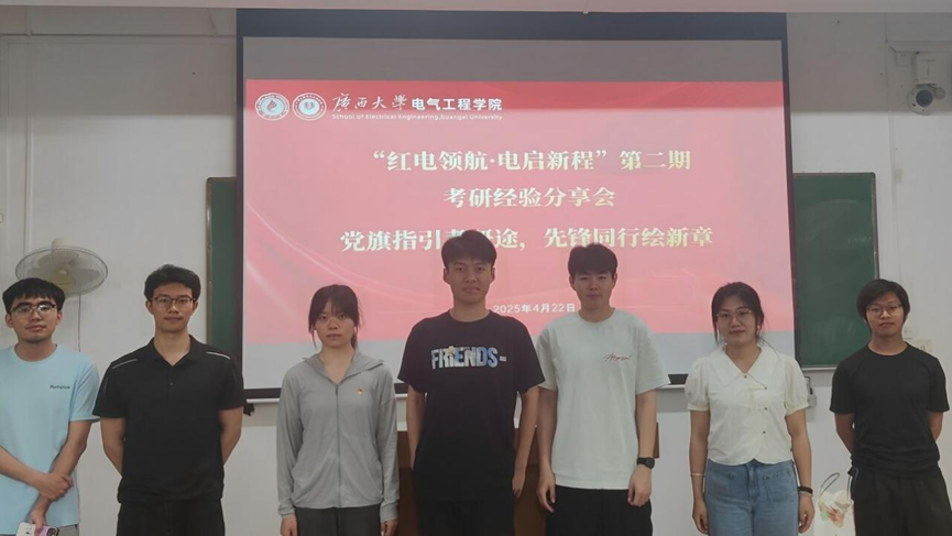 4月22日晚上,我院在西校园第二教学楼502教室举办 “红电领航・电启新程”第二期“党旗指引考研途,先锋同行绘新章”考研经验分享会。本次分享会由我院党建工作中心联合各学生党支部共同开展,旨在为有志于考研的本科生提供指导和交流平台。 来自不同党支部的党员们结合自身经历,为同学们带来了系统实用的考研准备指南。本科生第一党支部徐玉超、本科生第二党支部谢子康、本科生第三党支部杨宗霖和本科生第四党支部张冰分享了浙江大学、湖南大学、广西大学等院校的备考经验。 党员同志分享考研经验 徐玉超从时间管理角度切入,分析如何科学制定学习计划,解析公共课与专业课的时间分配策略;谢子康重点介绍了英语备考的技巧,并提醒同学们专业课复习的重要性;杨宗霖从早期择校、初试科目准备、考研心态以及学习过程中的一些注意事项进行经验分享与答疑;张冰聚焦研究生院校与导师选择,为同学们提供了切实可行的建议。 党员同志在分享 此外,来自研究生第一党支部的何博雯分享了研究生入学考试面试环节的实用技巧,并详细讲解了调剂的注意事项。2024级研究生莫皓翔结合自身经历,讲述了本科生与研究生学习生活的差异,帮助同学们更好地理解和适应未来的学术旅程,鼓励同学们以更坚定的信念勇敢逐梦。 何博雯在分享 分享人集体合照 此次考研经验分享会作为学院“红电领航”品牌活动的重要实践,不仅打造了朋辈互助的交流平台,同时推动红色精神在学业奋斗中的传承与践行,通过党员先锋的示范作用传递了坚持与拼搏的精神力量。参会同学纷纷表示,学长学姐们的倾囊相授既消除了信息壁垒,也为他们的考研之路点亮了一盏明灯,激励他们在追求升学梦想的道路上不断前行。