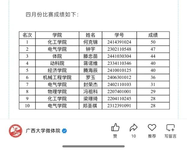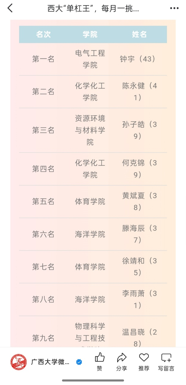 广西大学首届 “单杠王”挑战赛于3月27日开赛,该活动每月开展一次竞技比拼。电自235班钟宇同学在3月、4月的挑战中分别获得第一名、第二名;研234班郑圣祺同学获得4月挑战赛的第十名,展现电气学子良好的精神风貌。
