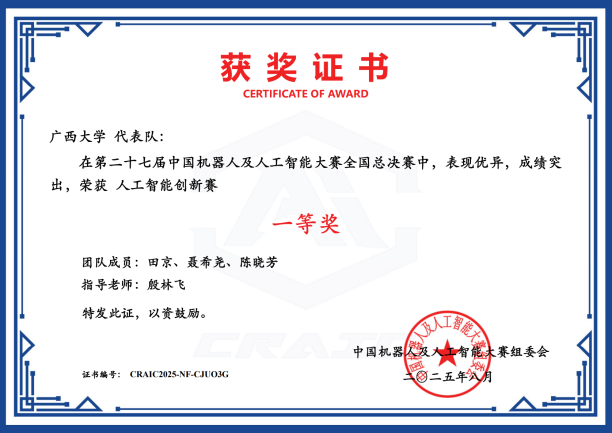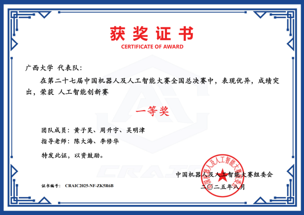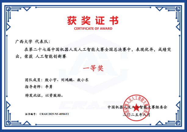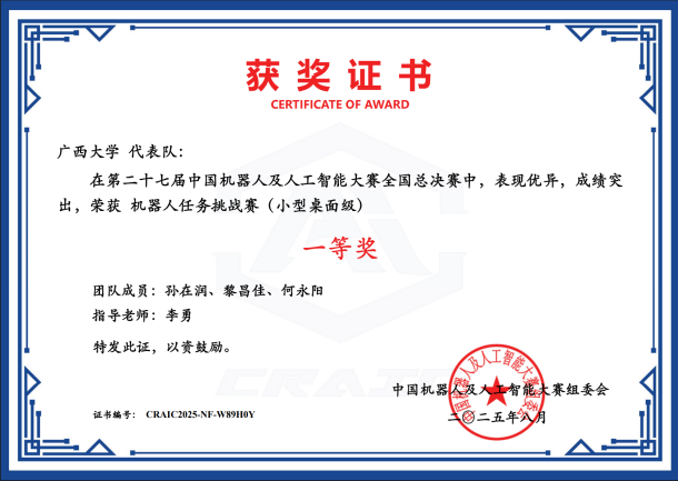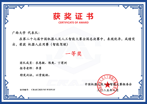 近日,第二十七届中国机器人及人工智能大赛落下帷幕,我院在本届比赛中荣获国家级奖项25项,其中一等奖6项、二等奖8项、三等奖11项;省级奖项53项,包括一等奖16项、二等奖21项、三等奖16项。此次大赛充分展现了学院在机器人及人工智能领域的实力与教学成果,是学院长期以来注重学科建设、创新实践与人才培养的集中体现,也为相关学科的持续发展与高水平人才培养注入了新动能。 01空-地-网协同,智慧防控病虫害 由黄子昊、周升宇、吴明津同学组成的团队(指导老师:陈大海、李修华)凭借《空-地-网协同病虫害智慧防控服务平台》获得人工智能创新赛全国一等奖。该项目针对农业病虫害监测效率低、防控不及时的痛点,构建了空-地-网一体化协同监测系统,利用多种数据分析,实现病虫害的实时监测、精准预警与智能防控,为农业病虫害防治提供了高效的智能化解决方案。 02优化算法创新,赋能电能交易 由田京、聂希尧、陈晓芳同学组成的团队(指导老师:殷林飞)凭借《基于一致性非洲秃鹫优化算法的商业楼宇电能交易研究》荣获人工智能创新赛全国一等奖。该项目聚焦商业楼宇电能交易优化难题,创新性地提出一致性非洲秃鹫优化算法,有效提升了电能交易决策的效率与精准度。 03水下无损检测,智能无人船领航 由殷小宇、刘鸿鹏、敖小东同学组成的团队(指导老师:李勇)凭借《水蓝之翼—智能无人船水下多源无损检测解决方案》斩获人工智能创新赛全国一等奖。该项目针对水下目标检测与识别的挑战,开发了基于智能无人船的多源无损检测系统,融合多种传感器技术与先进算法,实现对水下目标的高精度检测与识别,为海洋资源勘探、水下基础设施检测等领域提供了创新性的技术解决方案。 04智能船舶清理,守护水域环境 由孙在润、黎昌佳、何永阳同学组成的团队(指导老师:李勇)凭借《垃圾清理》在机器人任务挑战赛(小型桌面级)中荣获国家级一等奖。团队使用智能船通过视觉检测与识别技术对漂浮物进行精准定位与计数,并结合高精度导航与自主控制算法,实现对指定漂浮物的自动清理与回收。该方案融合了先进的传感器技术与智能算法,为水域垃圾清理提供了高效、智能化的创新解决方案。 05智能驾驶技术,赋能未来出行 由农悉敏、陈爽、丁渭洲同学组成的团队(指导老师:李勇)凭借《基于 YOLOv5 的 Cyber 智能车》在机器人应用赛(智能驾驶)中荣获国家级一等奖。该作品基于 YOLOv5 深度学习模型的智能车实现了高效的目标检测与智能驾驶决策,充分展示了在复杂环境下的实时感知与精准控制能力,展现了创新的比赛方案。 据悉,本届大赛自2025年3月启动以来,吸引了全国各地900余所高校参赛,参赛队伍达3万余个,参赛学生达9万余人。我院一直以来秉持着 “以赛促学、以赛促教、以赛促研” 的理念,高度重视学科竞赛工作,将其作为培养学生创新精神、实践能力和团队协作能力的重要途径。未来,学院将继续加大投入,不断完善学科竞赛体系,为培养更多具有创新精神和实践能力的高素质人才而努力奋斗,为推动我国机器人及人工智能领域的发展贡献更多力量。