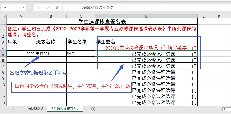 3、各班学委按班级名单填好《学生选课核查签名表》(附件表格的第二个工作簿),中的“年级”“班级名称”“学生名单”(即姓名)。各位同学核查后按要求签名,格式“张三(手签) 已完成必修课程选课 5(手填) 门”。如下图