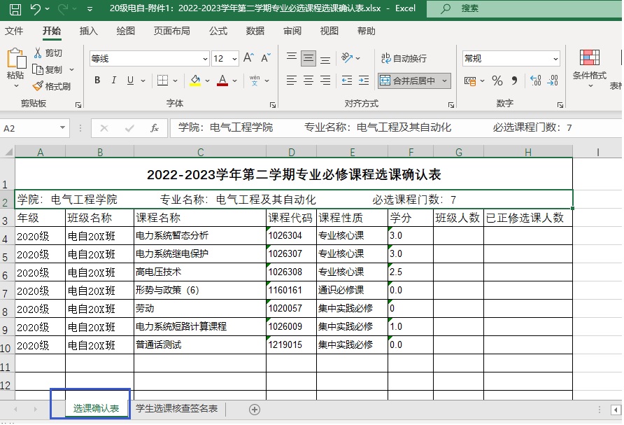 1、按通知要求教学办已经填写各年级、专业《2022-2023学年第二学期专业必修课程选课确认表》,见附件。各同学下载对照核查自己的选课。如下图