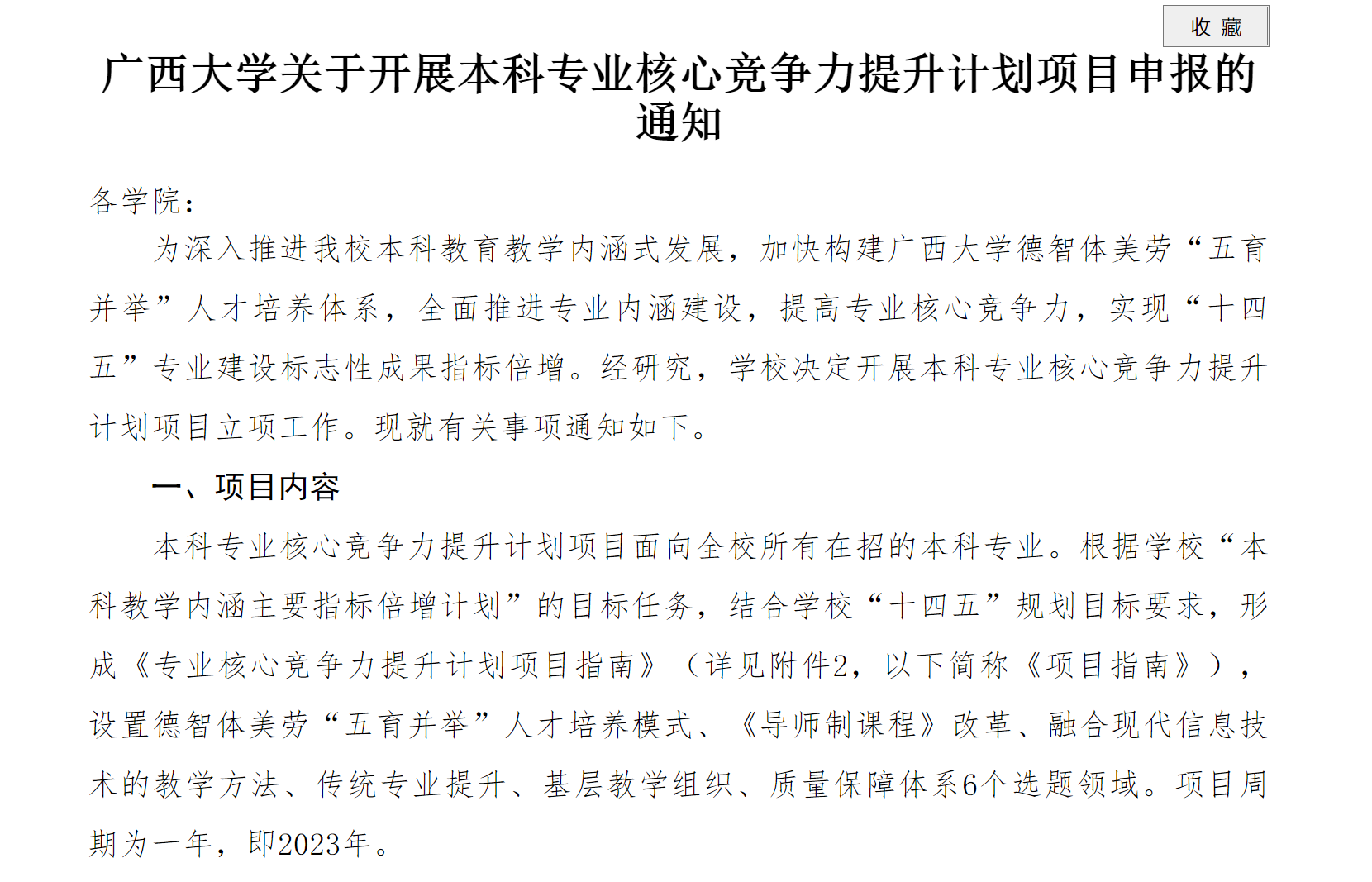 (2)研讨专业建设项目。各系负责人请提前按学校文件系统中10月20日发布的《广西大学关于开展本科专业核心竞争力提升计划项目申报的通知》,做好项目申报布局与讨论,物色好各项目的牵头人,按指南要求撰写2023年专业核心竞争力提升计划任务书,其中德智体美劳“五育并举”人才培养模式选题由学院统一做。注:这将是我们各专业明年的专业建设经费。