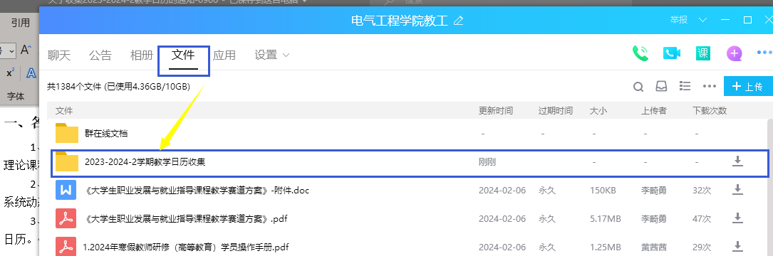 2)收集方式:进教工QQ群界面—文件—教学日历(2023-2024-2)文件夹—上传