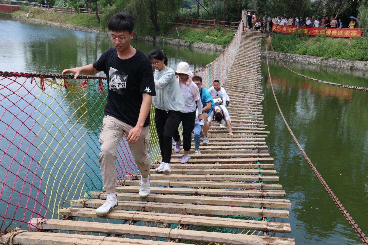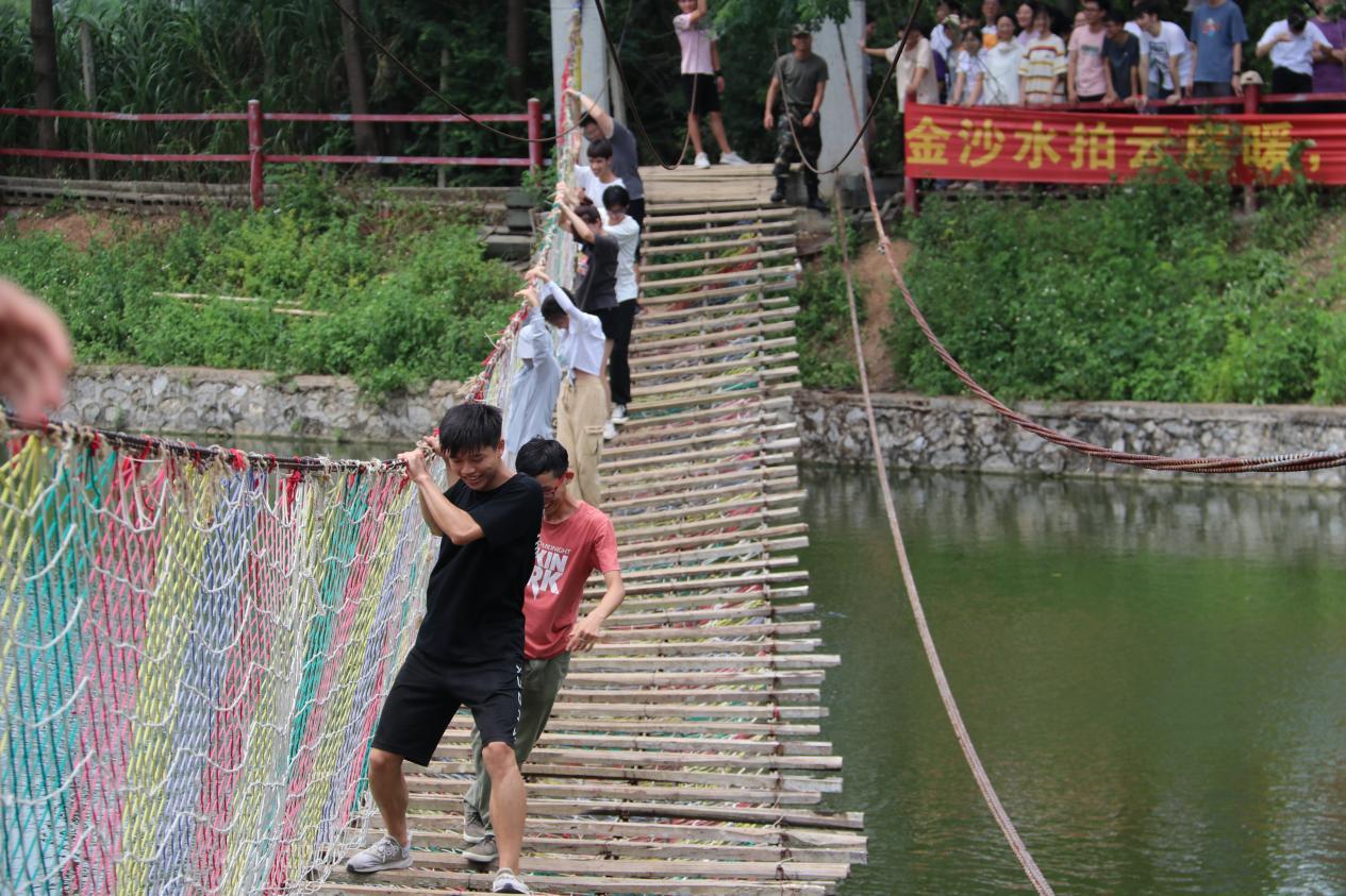 时光匆匆,转眼便来到了下午。在教官的带领下,一行人来到了“飞夺泸定桥”的体验地点。一眼望去,映入眼帘的便是几条铁索在空中摇荡,只有几块木板交替搭建在铁索之中。队伍依次前行,渡桥摇摇晃晃,底下便是湖泊,仿佛回到了当年红军飞夺泸定桥的场景,在敌人的火力里,冒死搭桥,“大渡桥横铁索寒”。艰难爬过“泸定桥”之后,心中对老红军的敬佩之情油然而生,实际地体会到了何为“长征精神”。